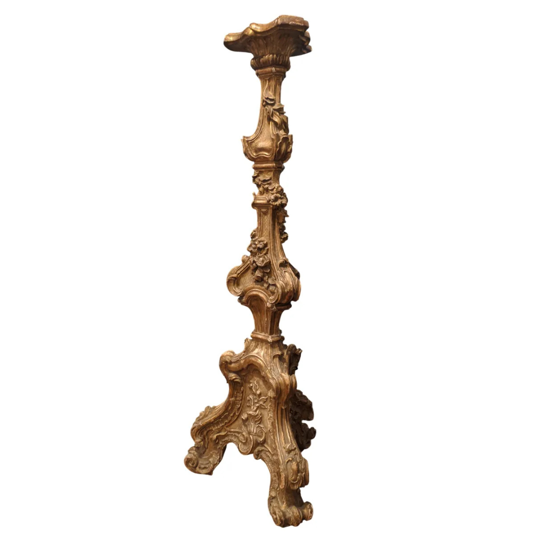 Grande torciere in legno dorato, intagliato e decorato con motivi vegetali e a volute. Poggia su tre piedi leonini.