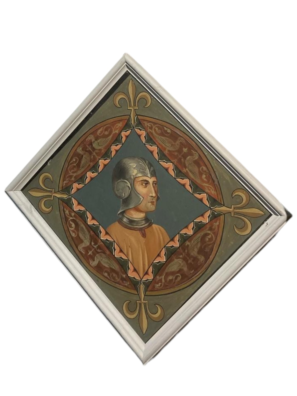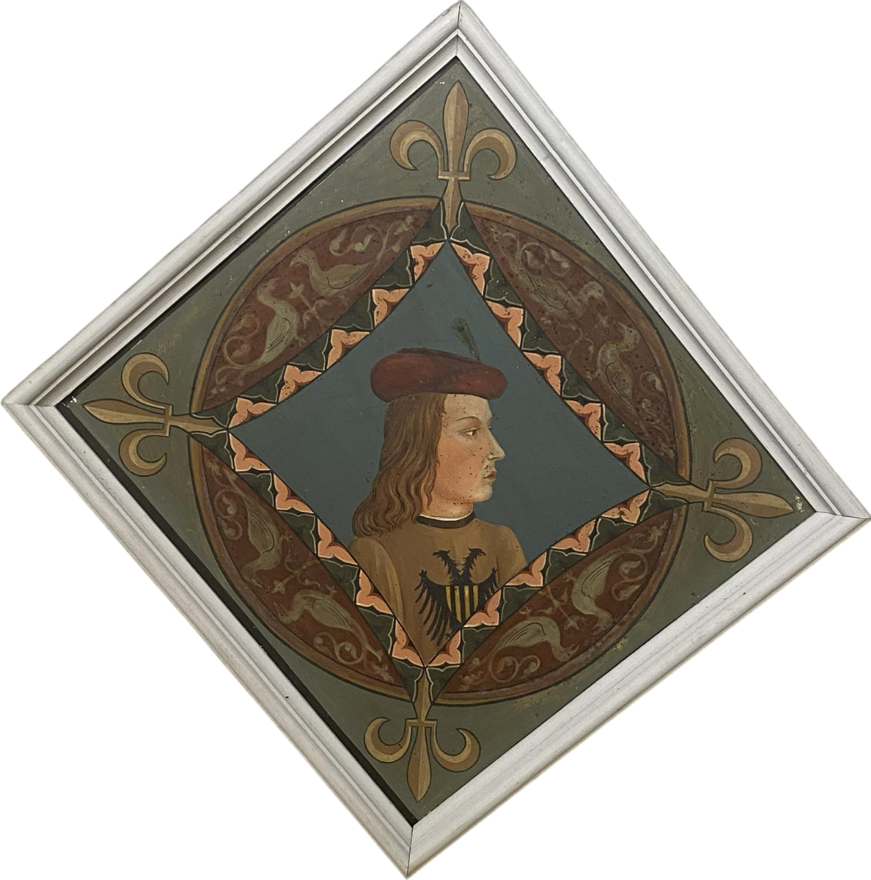 Nel soffitto cassettonato della camera da letto, perimetrato da figure zoomorfe, il principe, fece collocare nei lacunari 144 pannelli metallici dipinti, suddivisi a gruppi di quattro comprendenti ciascuno coppie di ritratti d’invenzione, o tratti da repertori rinascimentali, posti in diagonale ai quali si alternavano nei due