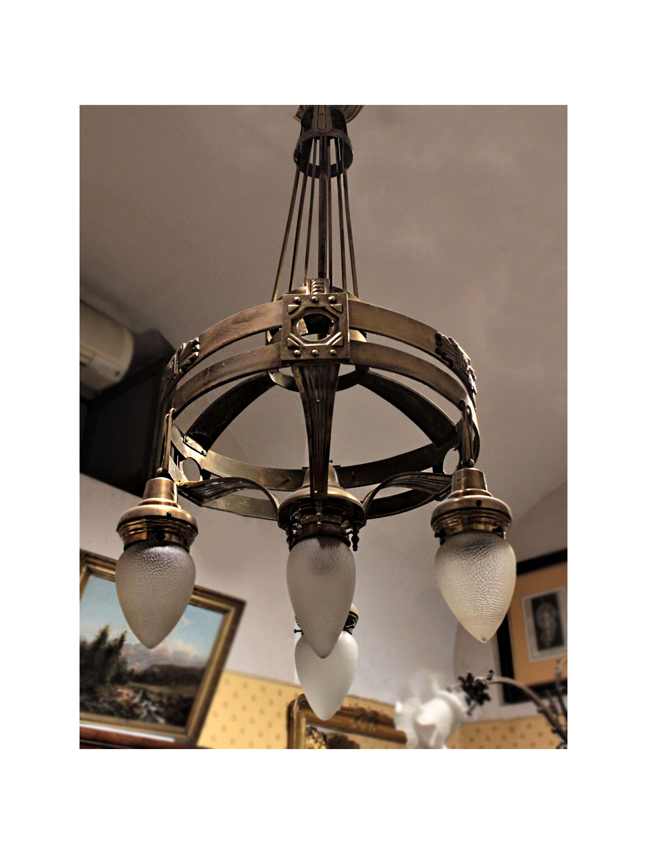 Lampadario a quattro luci in rame dorato con paralumi in vetro opaco a forma di pigna.