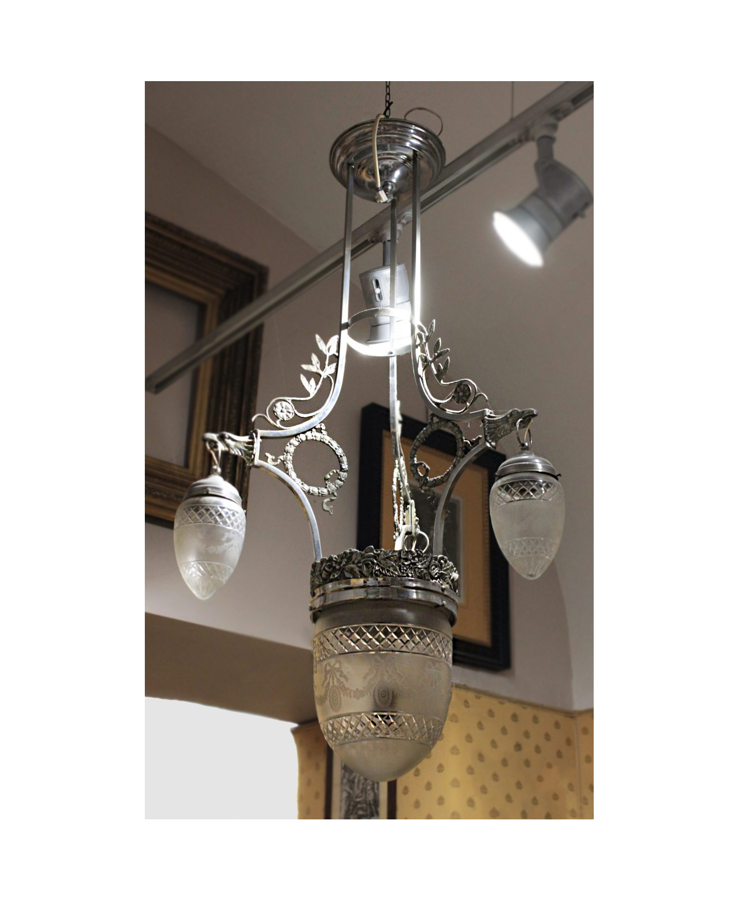 Lampadario a quattro luci in rame bianco e paralumi in vetro opaco e inciso.
