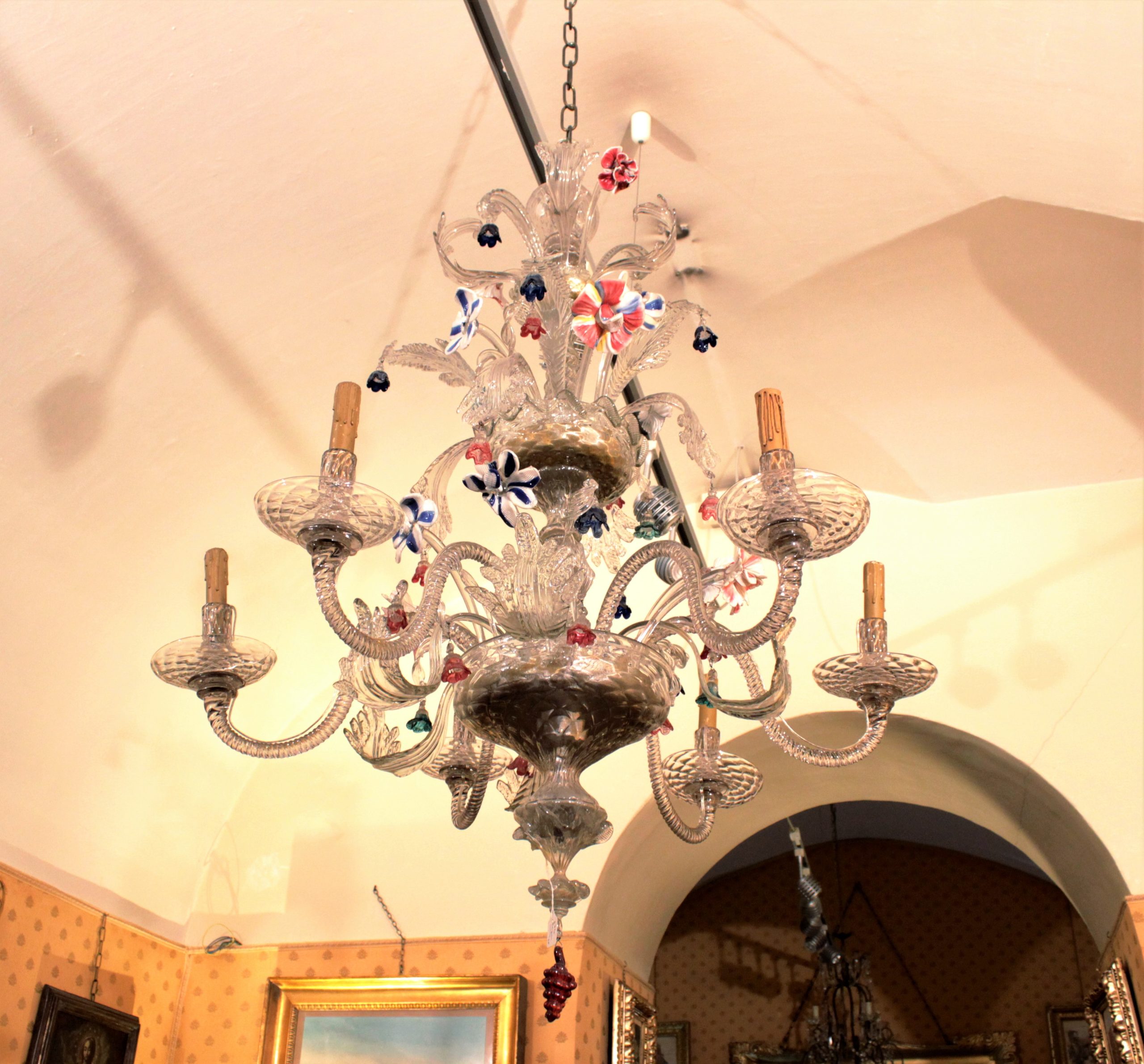 Lampadario a sei luci con motivi a fogliame, fiori policromi e pendente a grappolo d’uva.