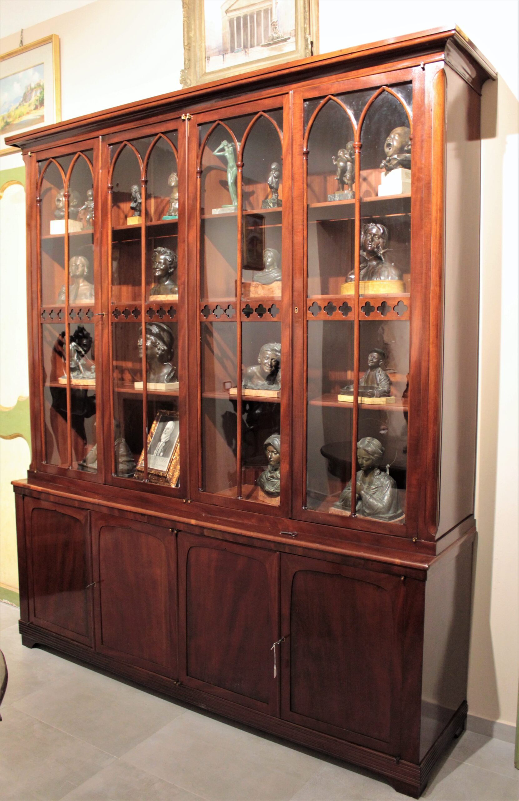 Libreria con quattro ante a vetri, decorate da bifore e archetti ogivali