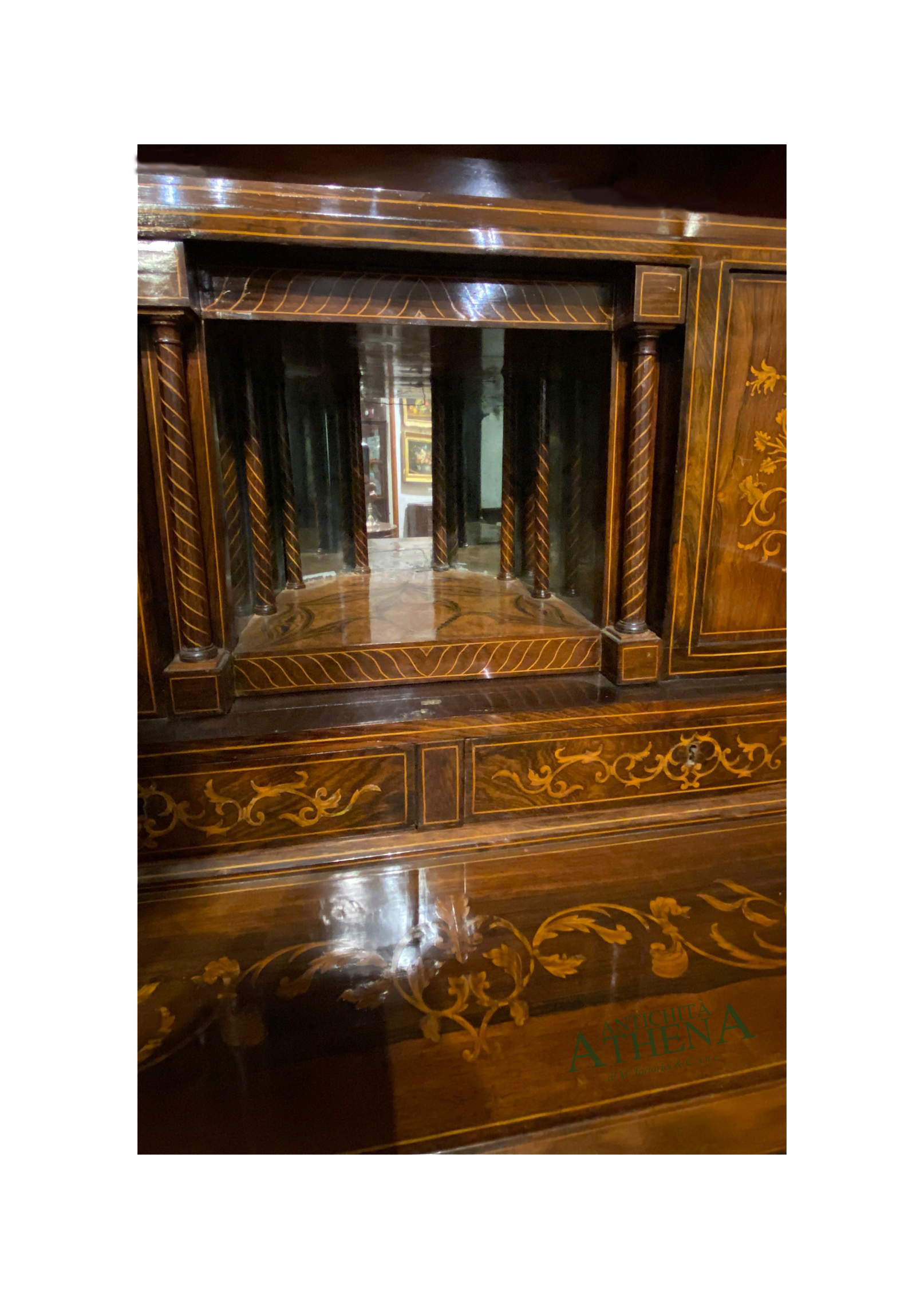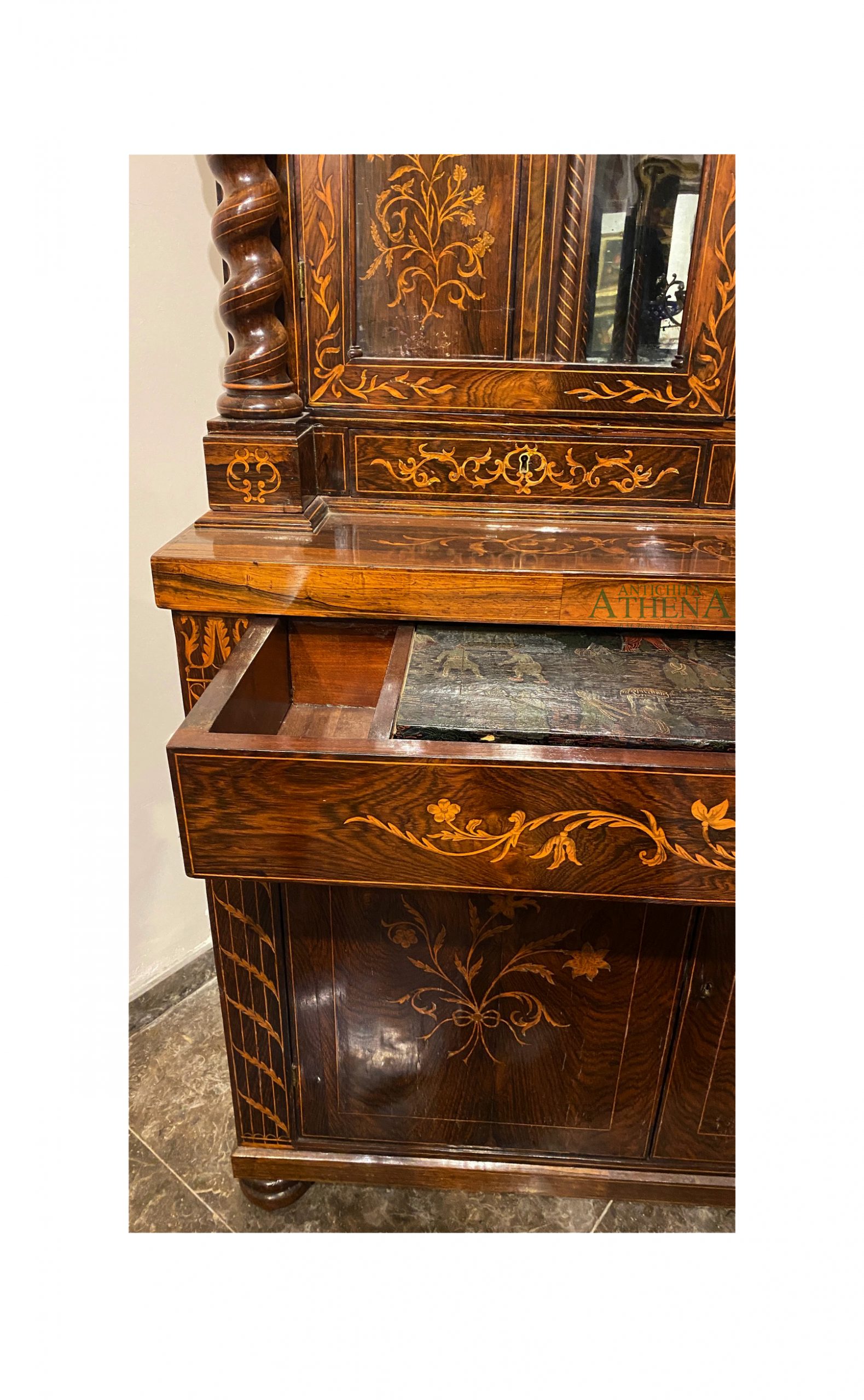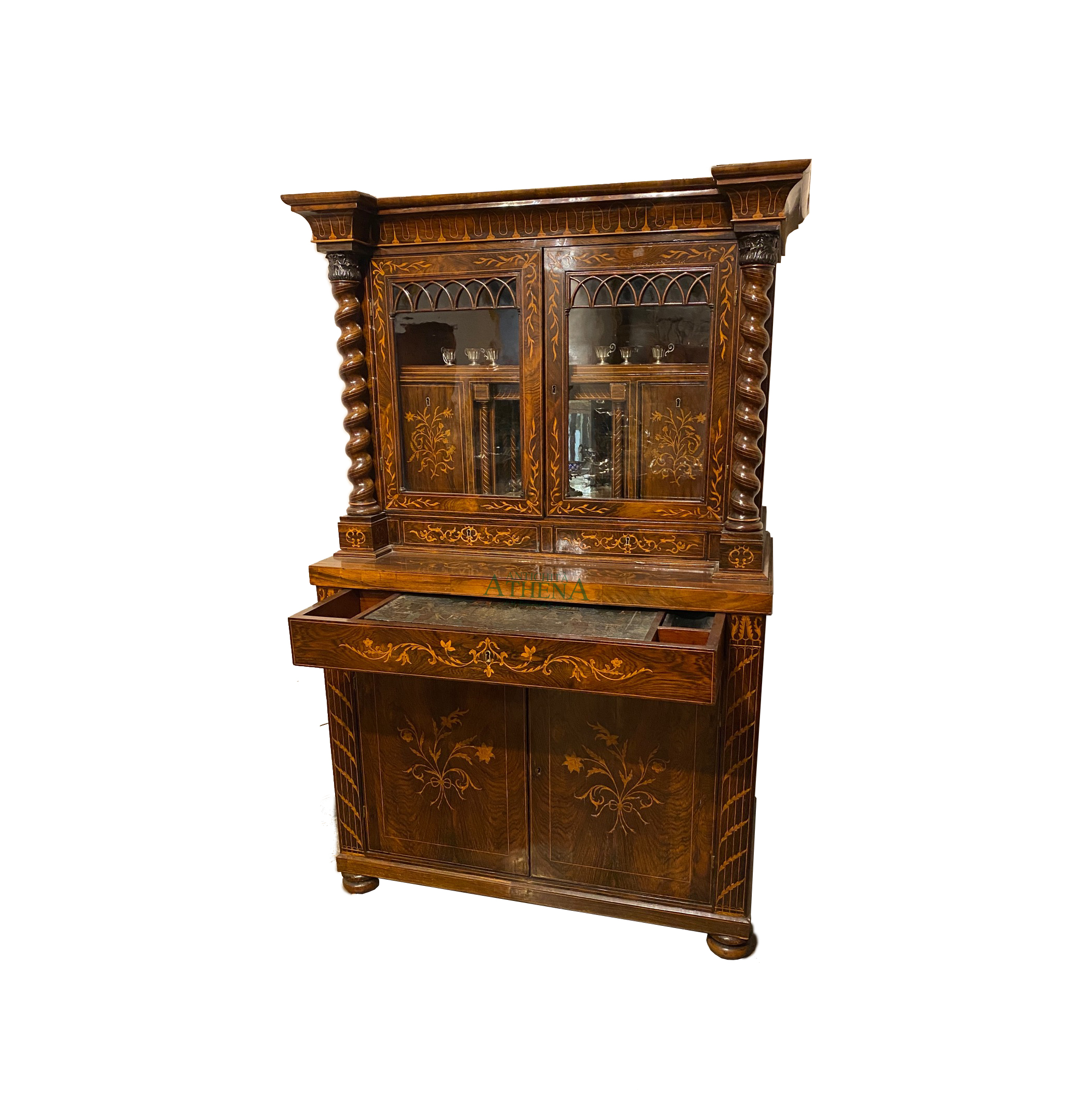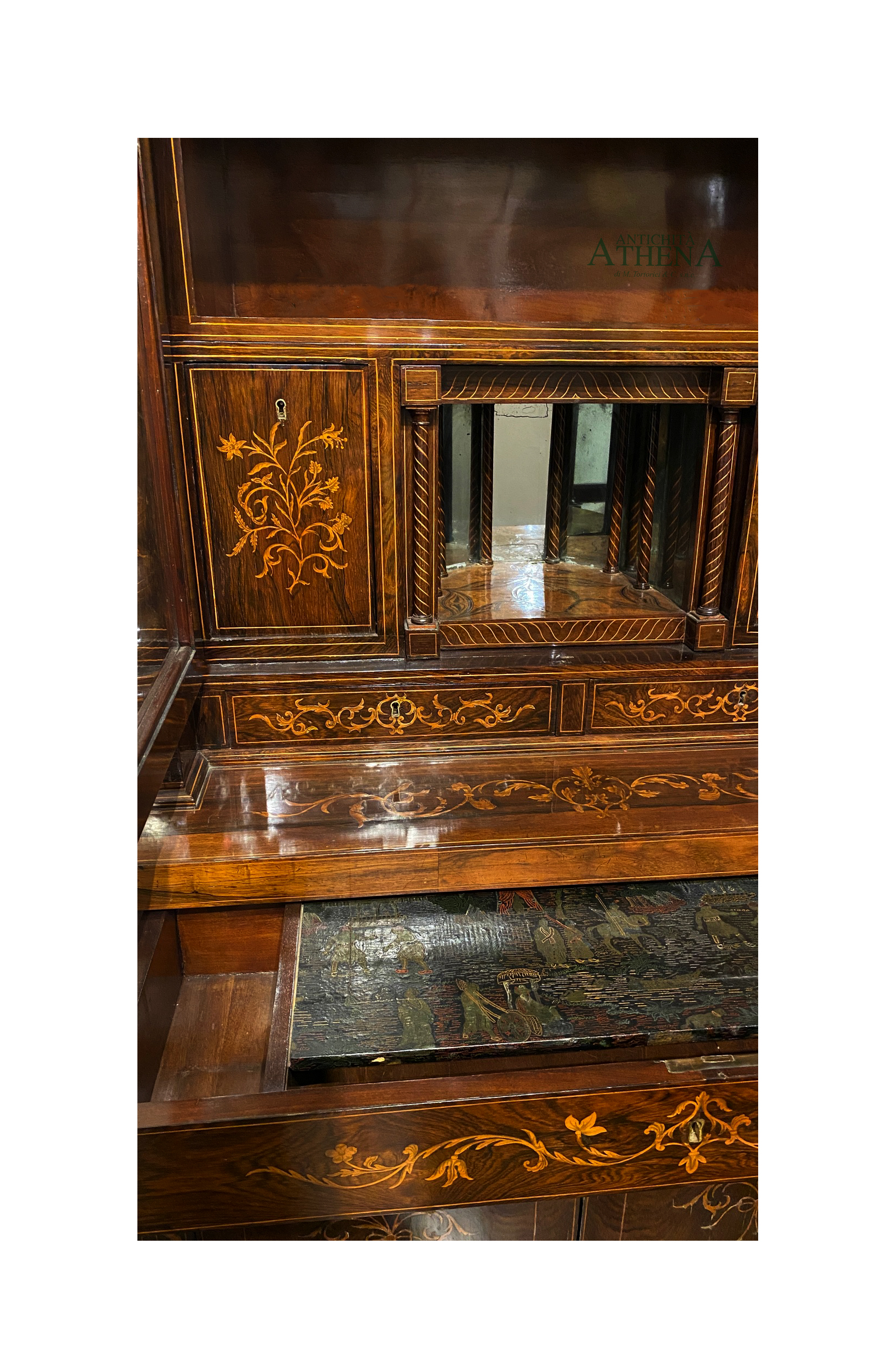 Mobile a doppio corpo impiallacciato in legno di palissandro; un impianto architettonico con base a due ante, cassetto con all’interno uno scrittoio con piano in cuoio stampato e decorato a chinoiserie, alzata con due sportelli a vetro entro colonnine a torciglione, interno con vani e sportelli.