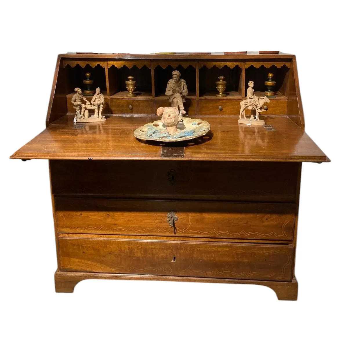 Mobile a ribalta in noce massello e intarsi in bosso a tre cassetti più ribalta.