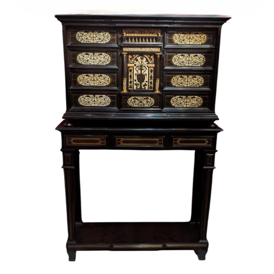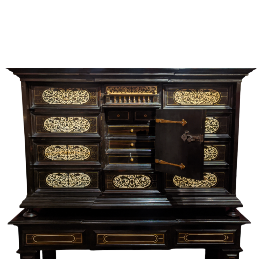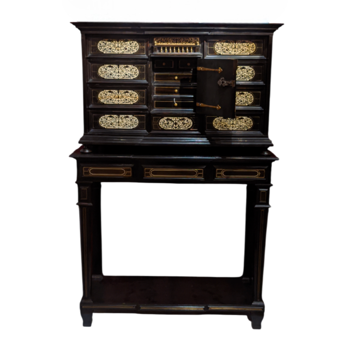 Monetario realizzato in ebano con un raffinata serie di piccoli cassetti disposti simmetricamente, arricchiti da intarsi in osso a motivi fitomorfi e decorativi. Al centro presenta un’architettura scenografica con sportello, scandita da colonnine, con segreti. Il mobile poggia su un tavolo con gambe tornite e rastremate, collegate da traversa, che conferiscono slancio e stabilità all’insieme. L’alternanza tra l’ebano scuro e l’osso chiaro valorizza la ricchezza decorativa del mobile, restituendo un effetto di grande eleganza e pregio artigianale.