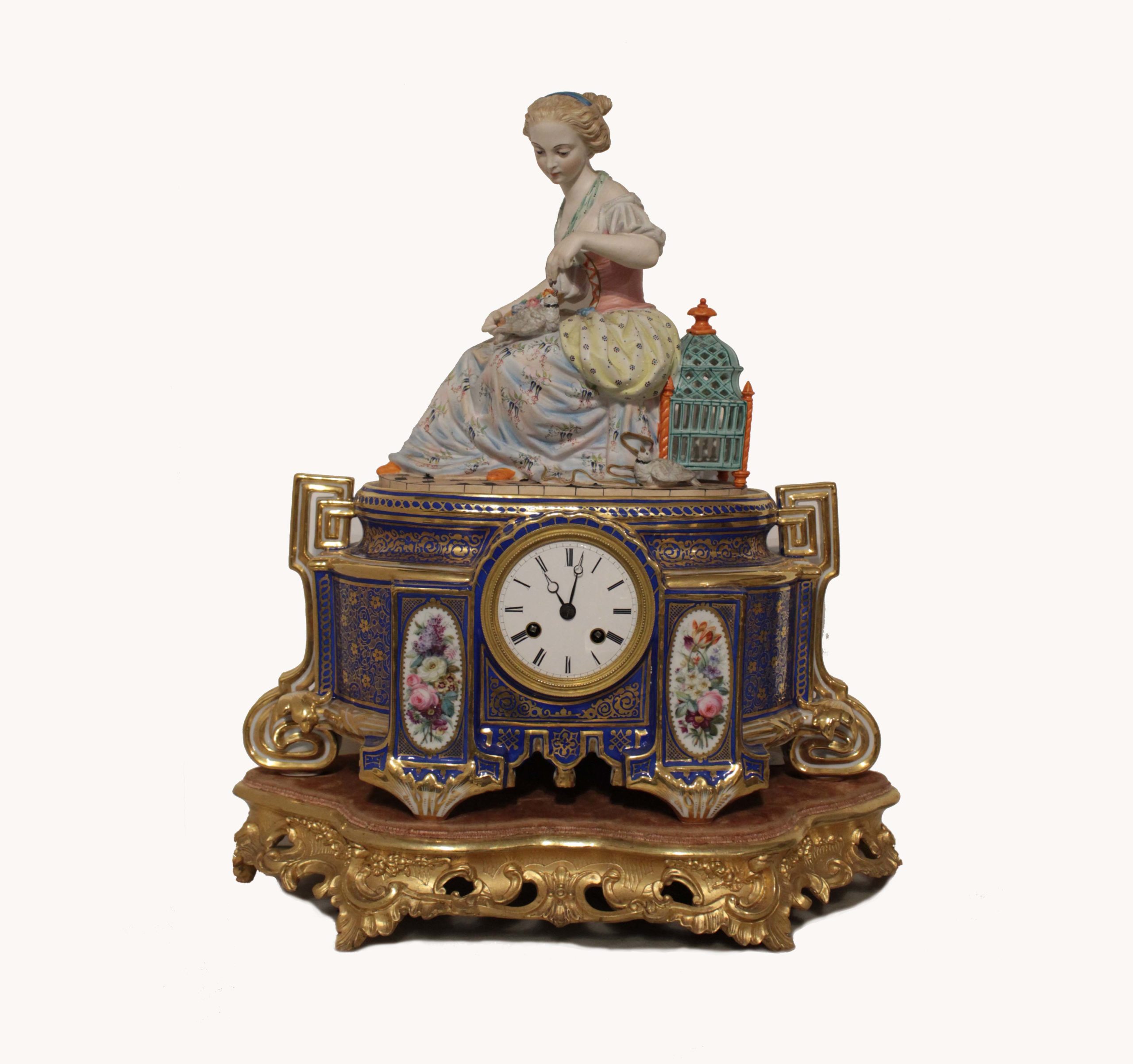 porcellana e biscuit policromi, oro zecchino, quadrante in porcellana e cornice in bronzo dorato;