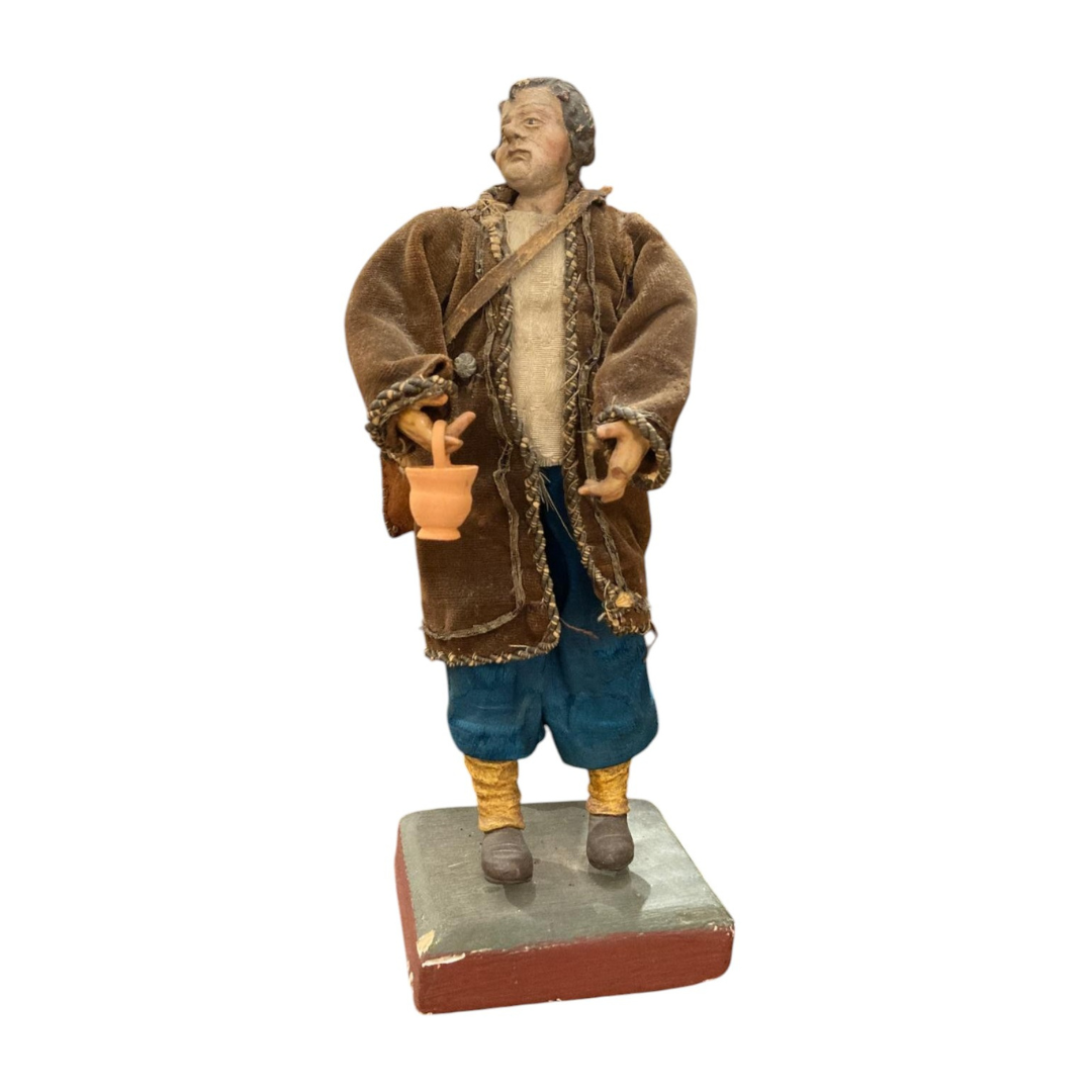 Personaggio da presepe raffigurante un uomo, realizzato con viso e arti in ceramica, mentre il corpo è una struttura in legno rivestita in tessuti.