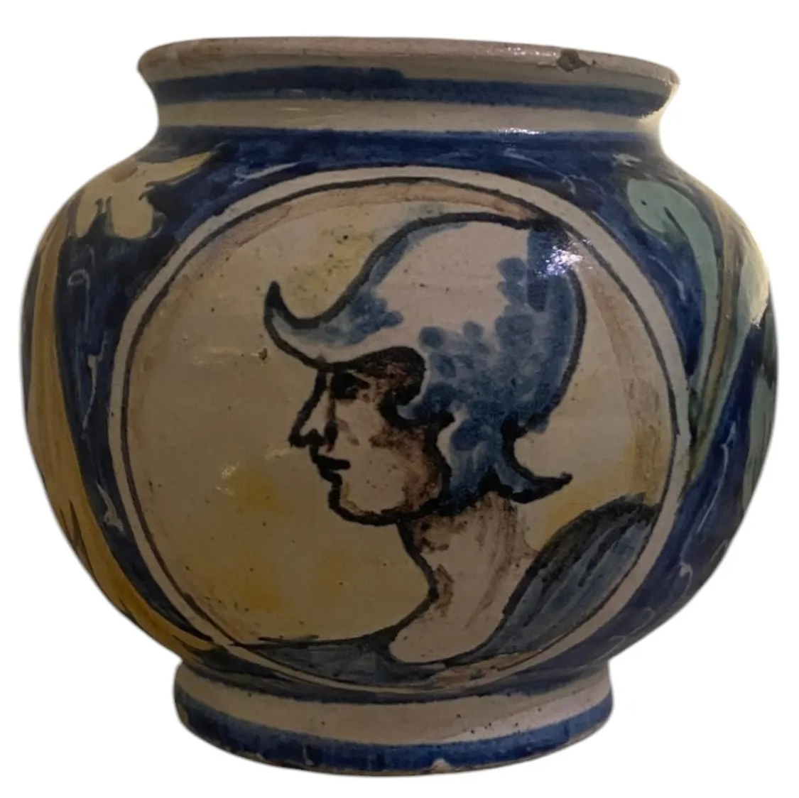 Boccia in maiolica di Caltagirone di Manifattura Celestino di Bartolo con medaglione centrale raffigurante guerriero e decorazioni a fogliami su sfondo blu.