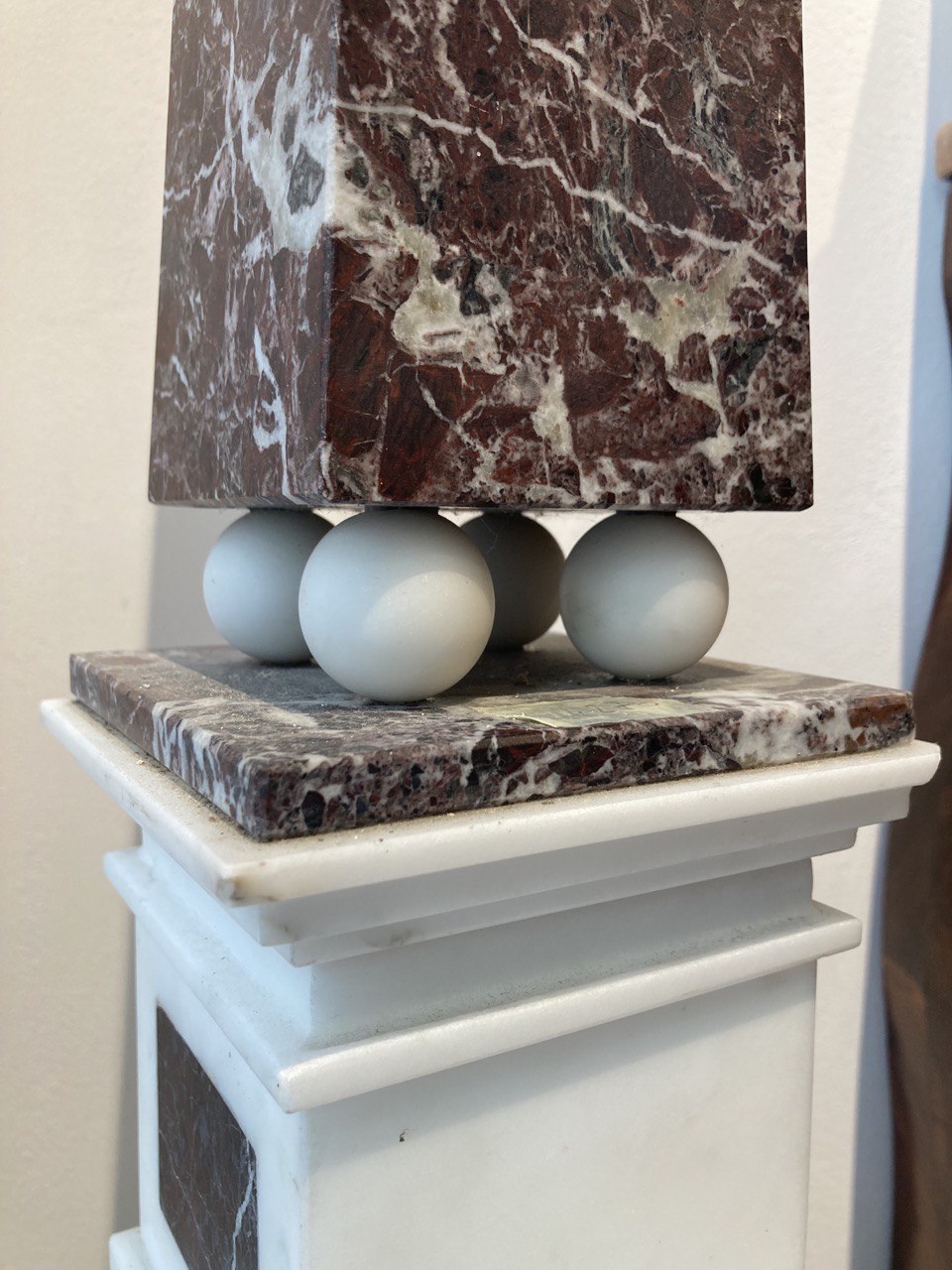 Piccolo obelisco di vecchia manifattura in marmo rosso e bianco.
