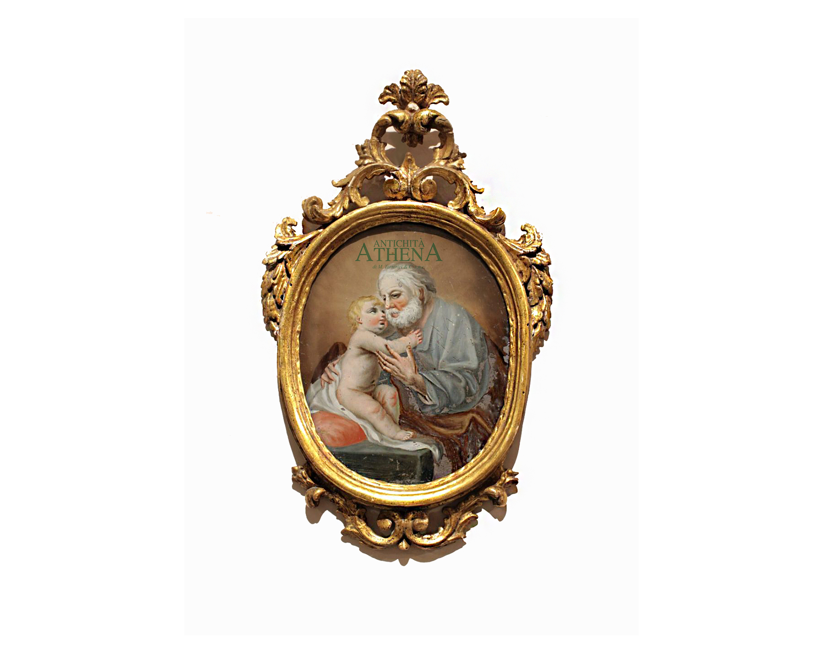 Piccola pittura su vetro raffigurante San Giuseppe e il Bambino Gesù