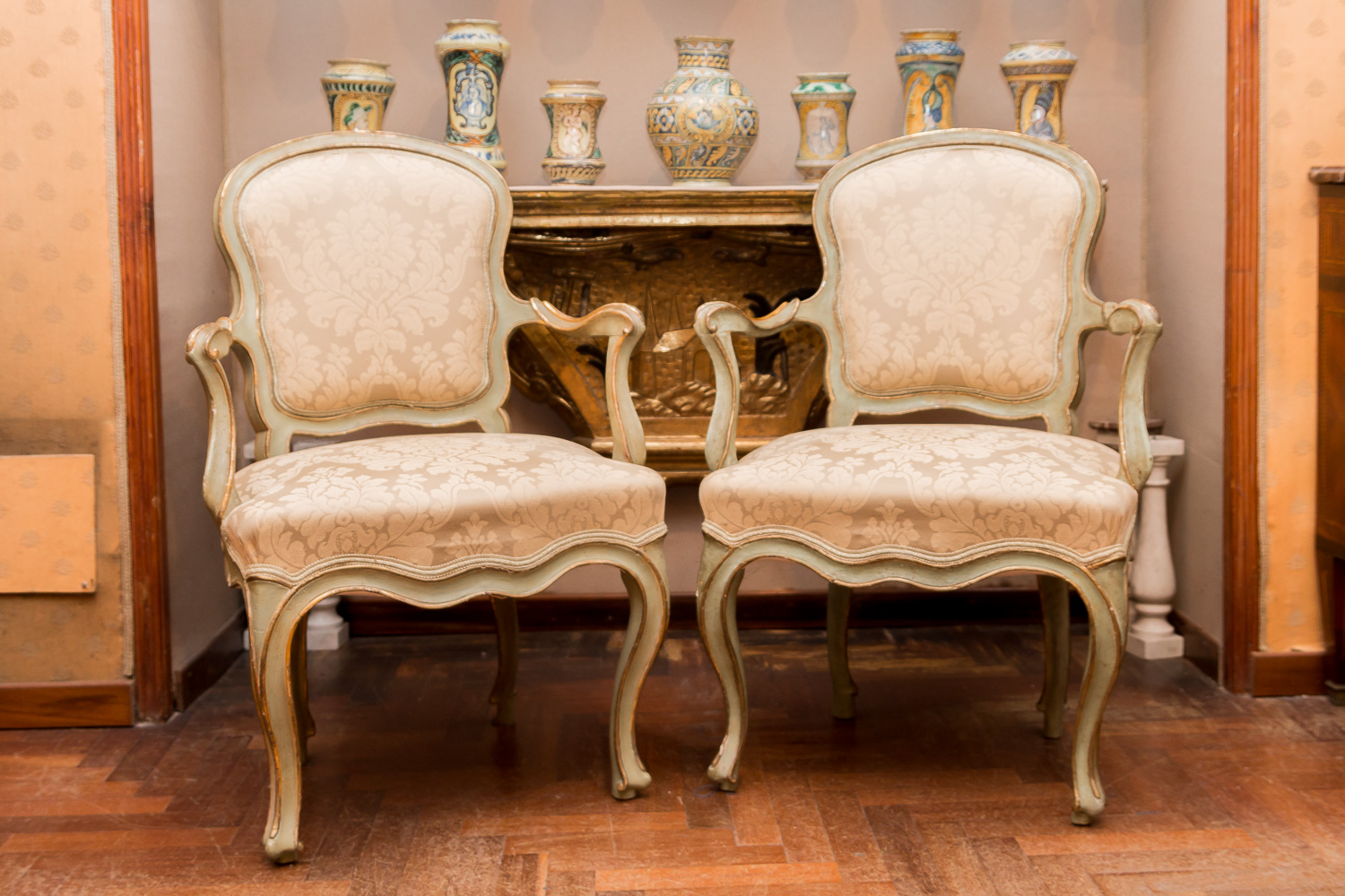 Coppia di poltrone laccate e dorate verde e oro