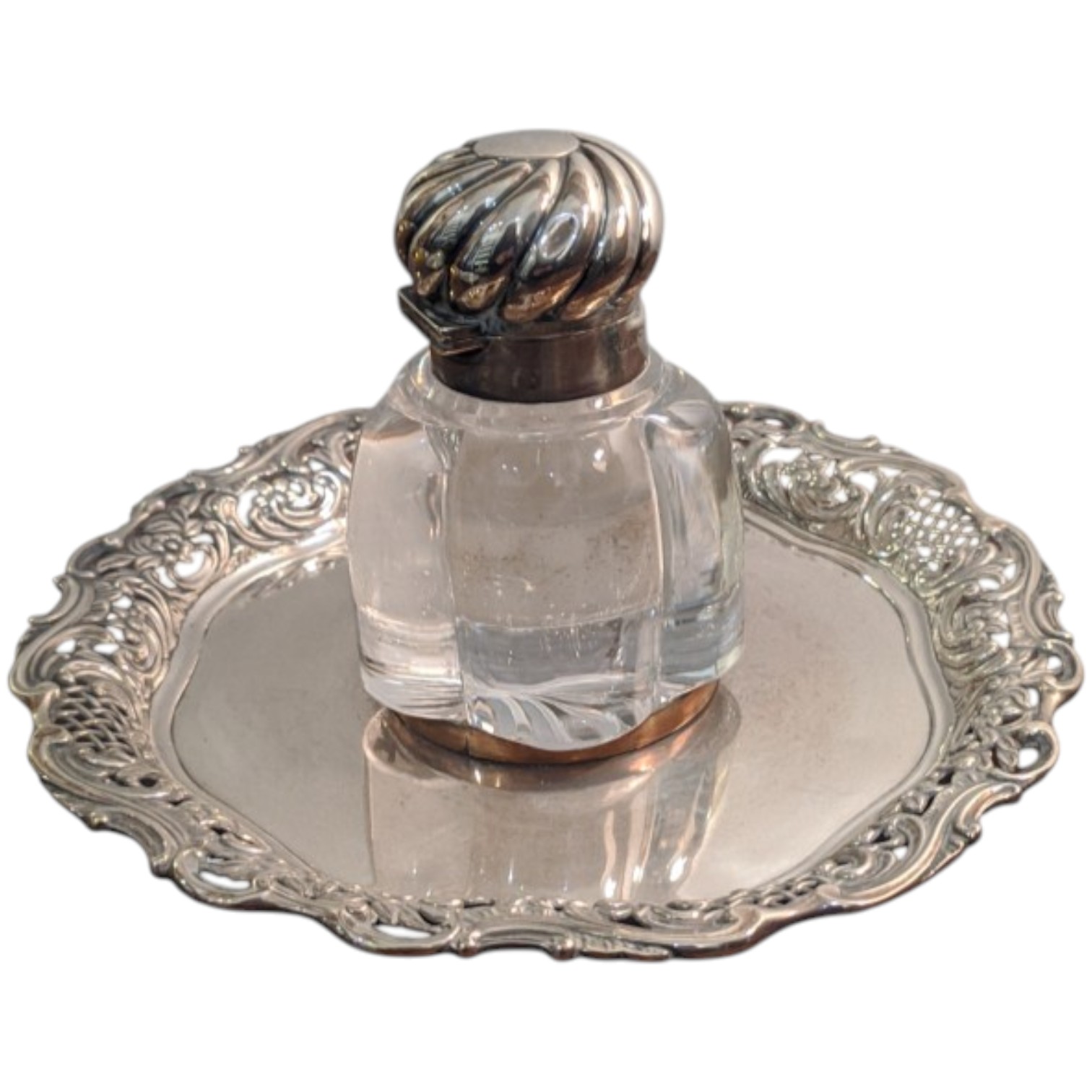 Piccolo porta inchiostro con piattino in argento finemente decorato a motivi vegetale e ampolla in vetro