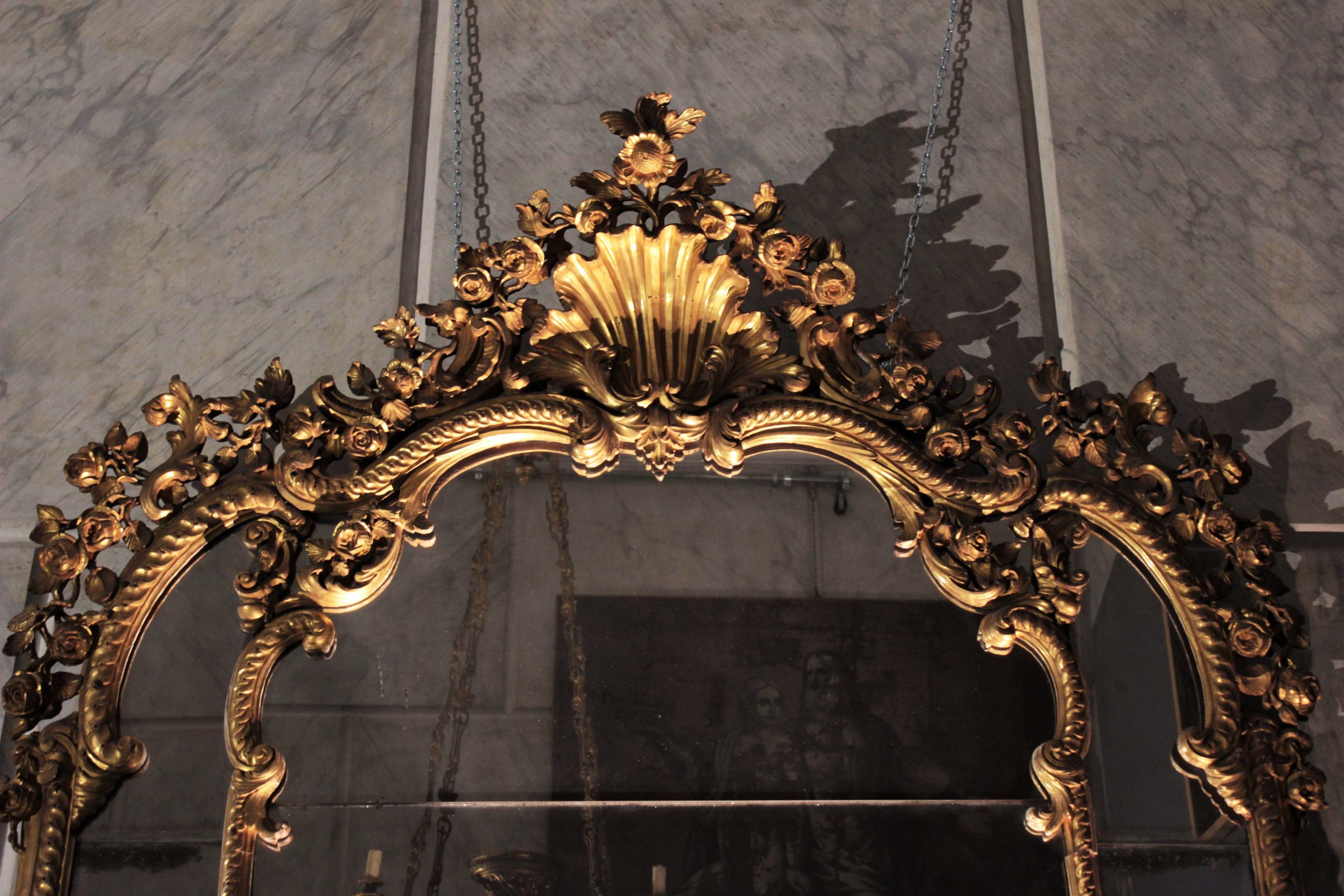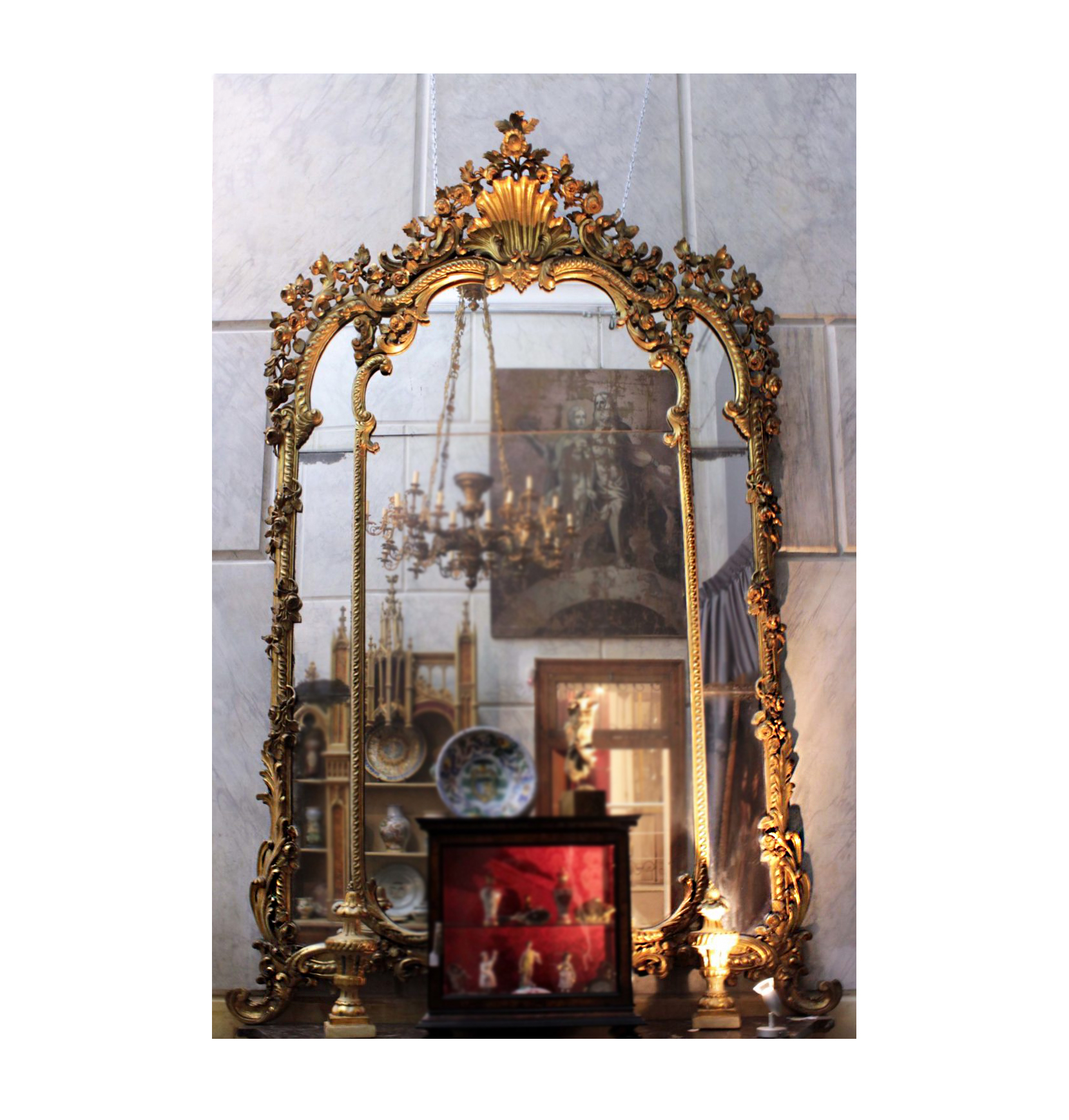 Grande ed elegante specchiera a doppia cornice con raffinati intagli floreali, volute e conchiglie. Cornice in legno intagliato e dorato a “zecchino”