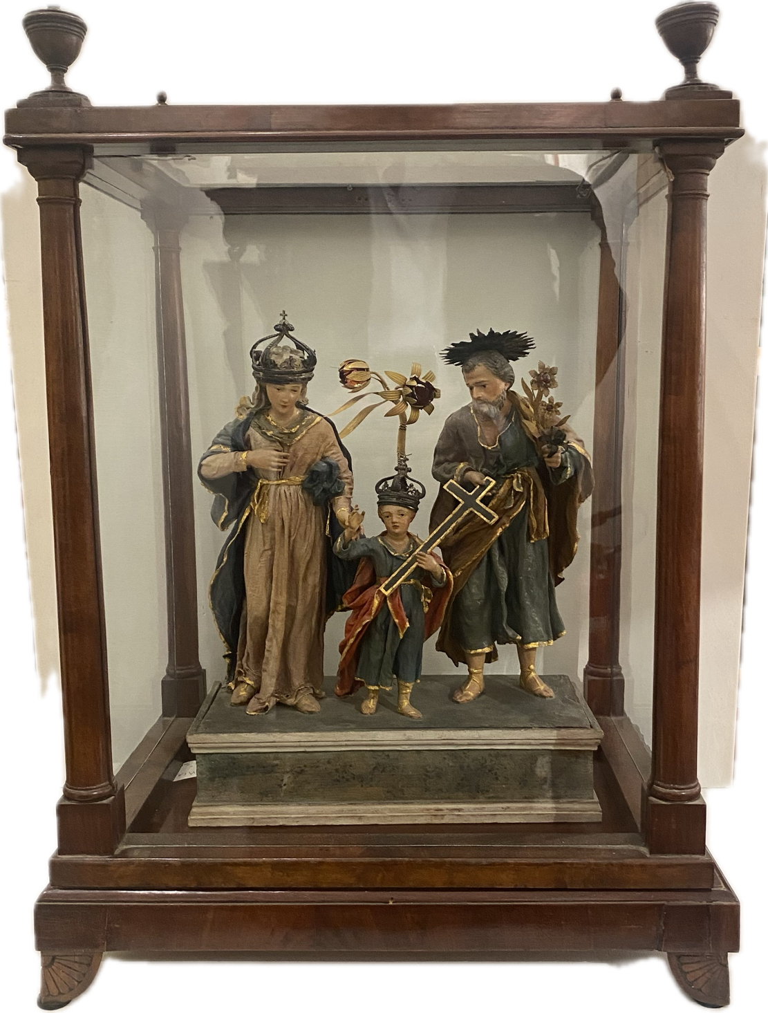 Sacra famiglia del XVIII secolo entro teca in legno di piuma di mogano Sicilia epoca impero