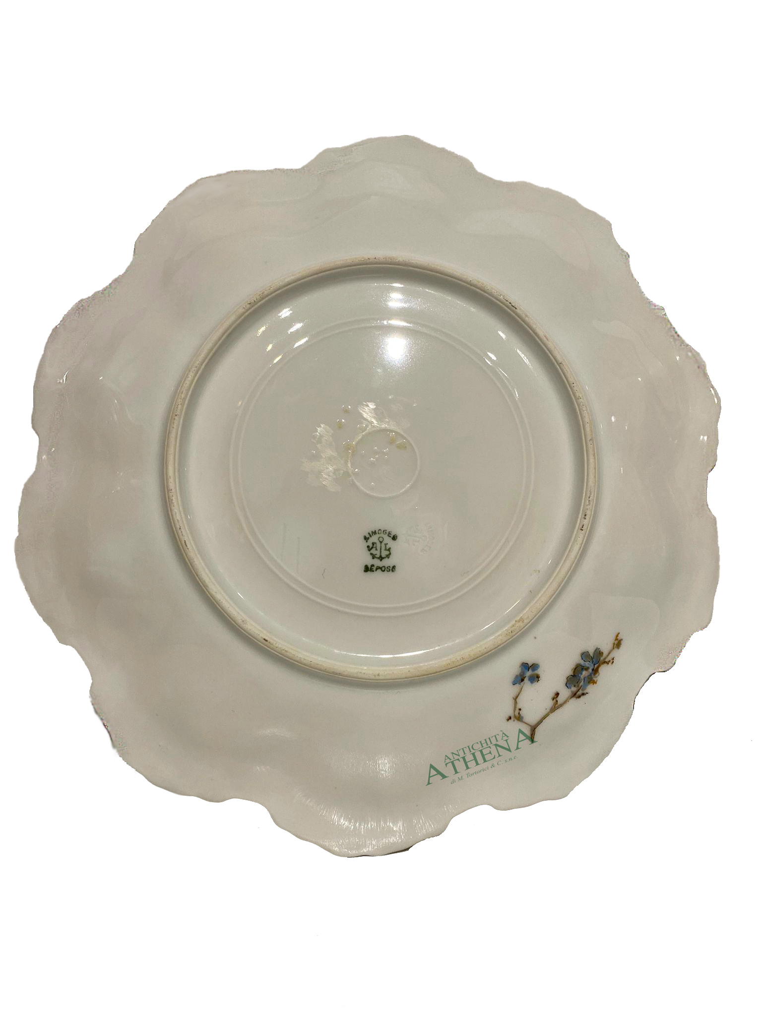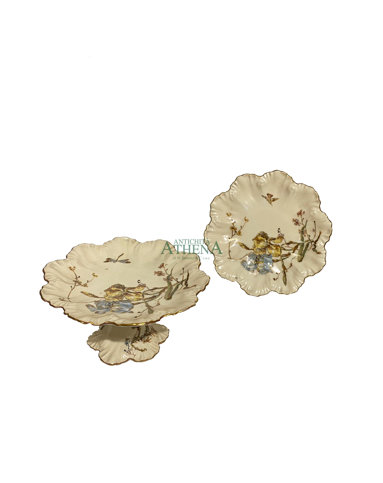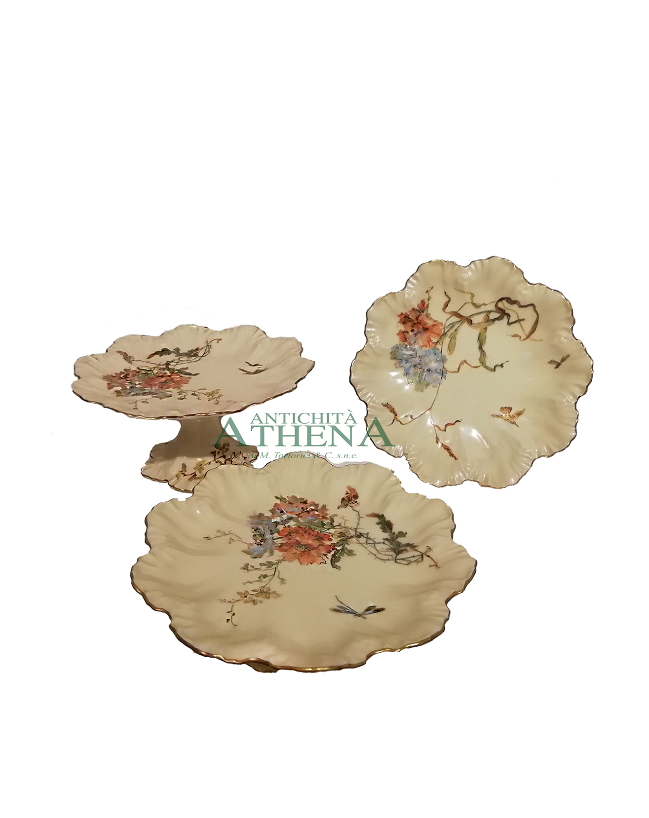 Due alzatine e piatto in porcellana di Limoges con decorazione floreale e farfalle su fondo bianco – crema.