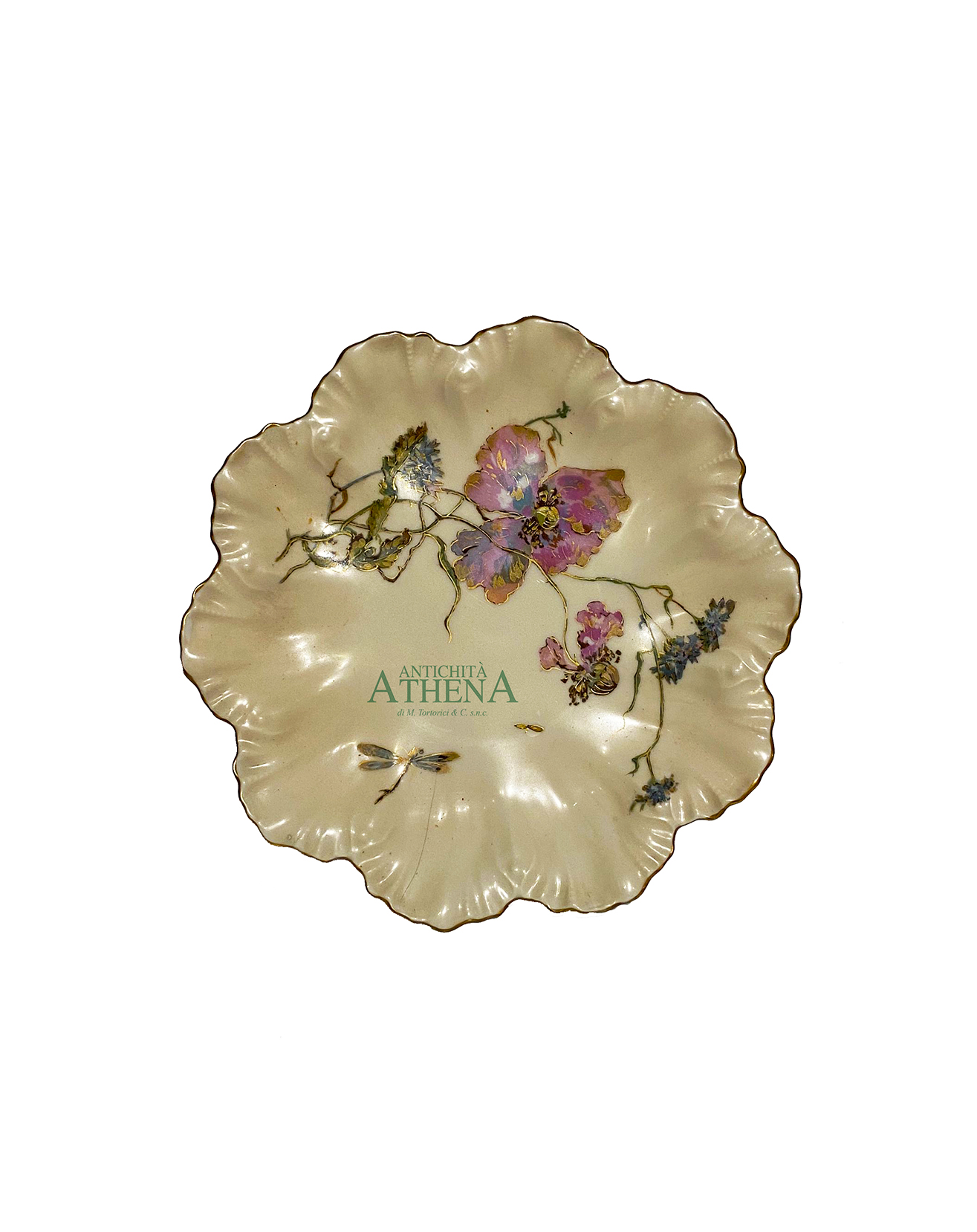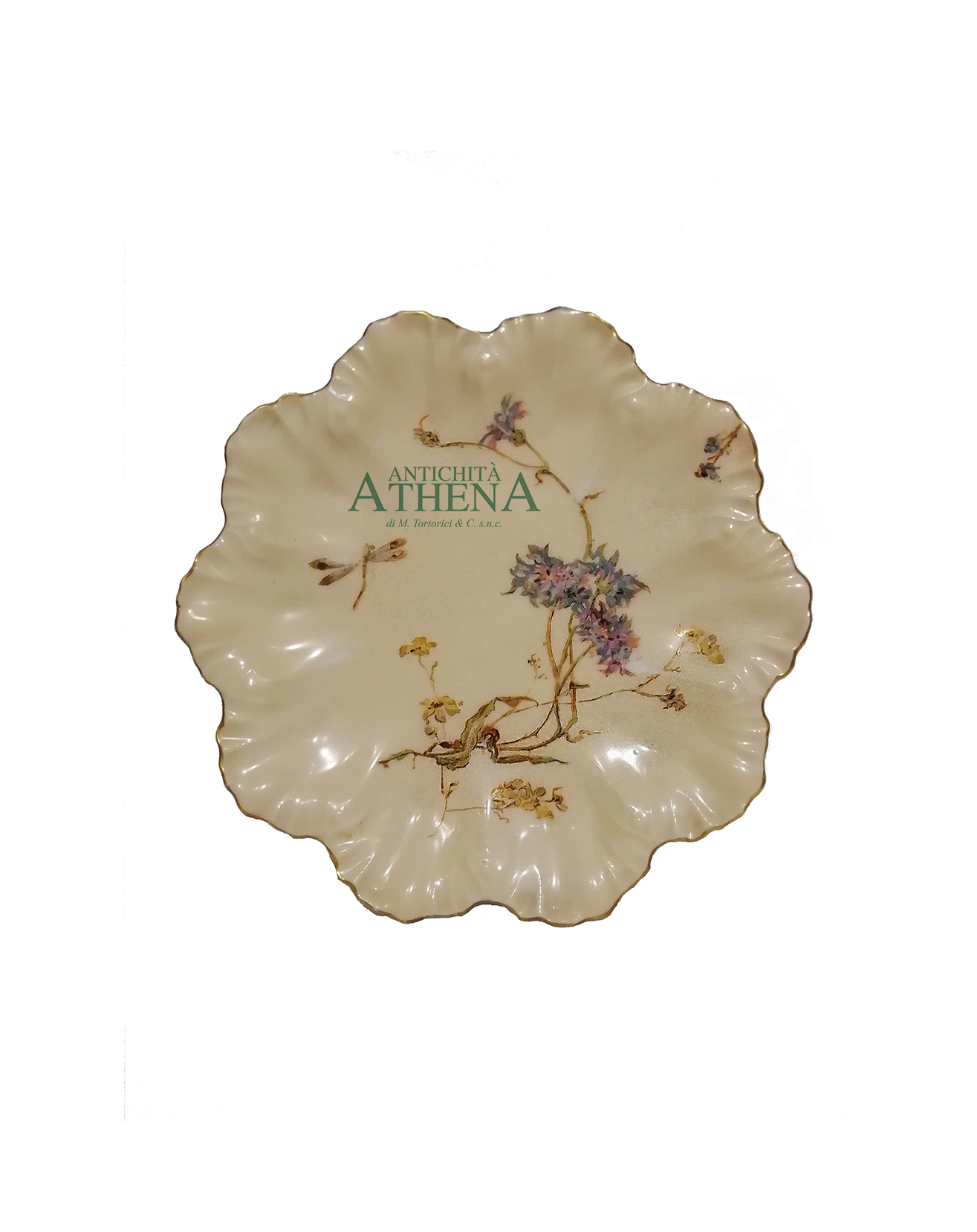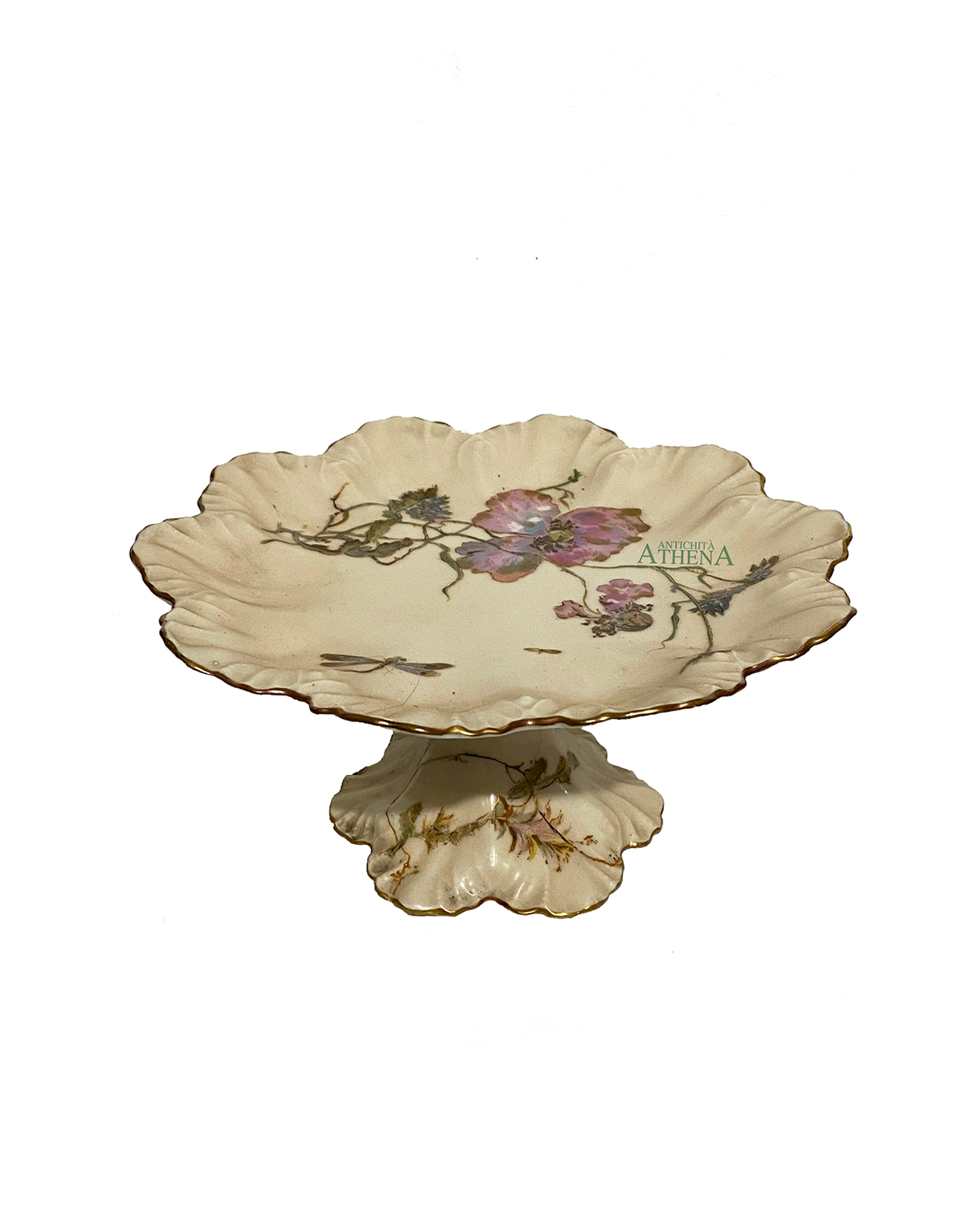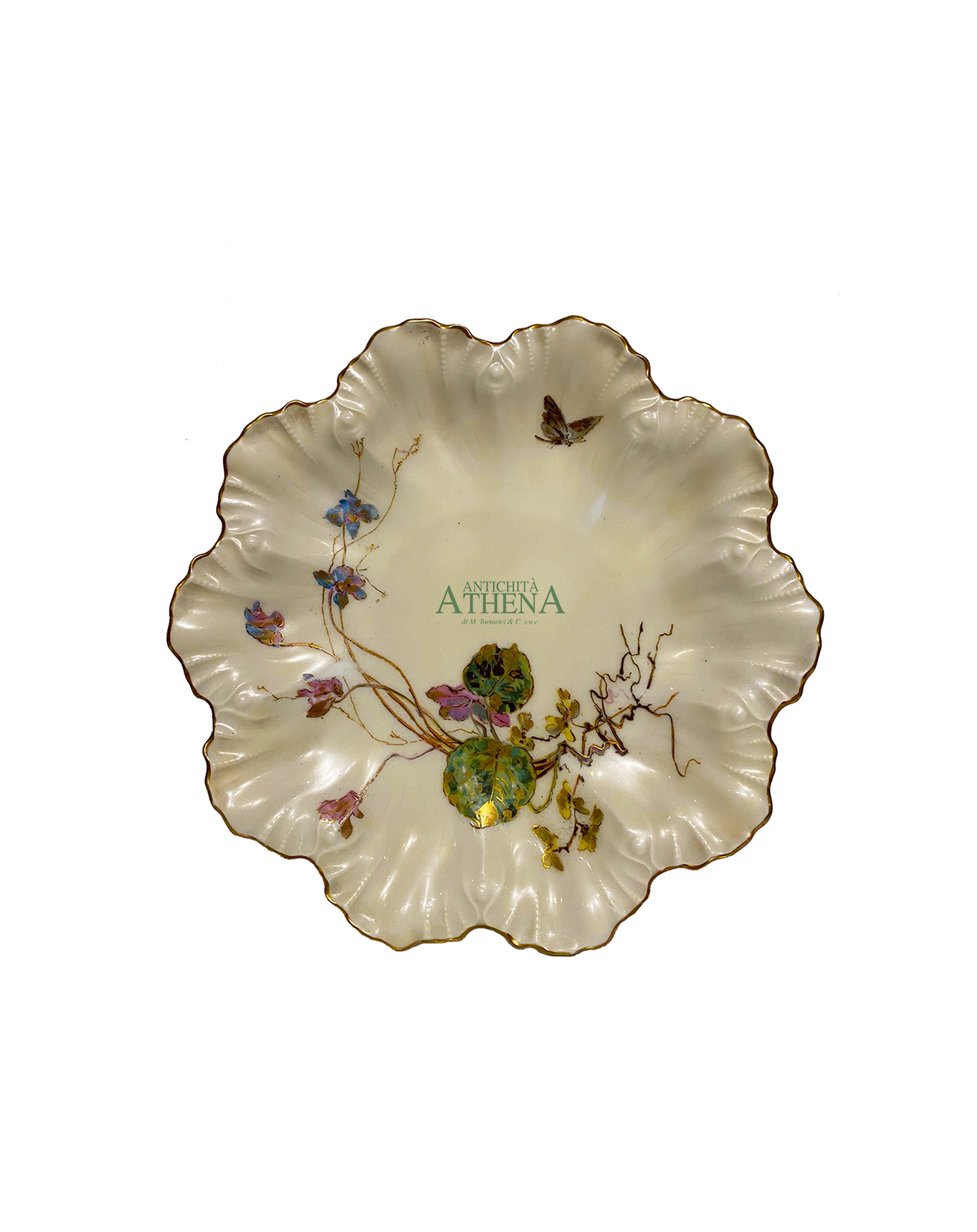 Due alzatine e piatto in porcellana di Limoges con decorazione floreale e farfalle su fondo bianco – crema.