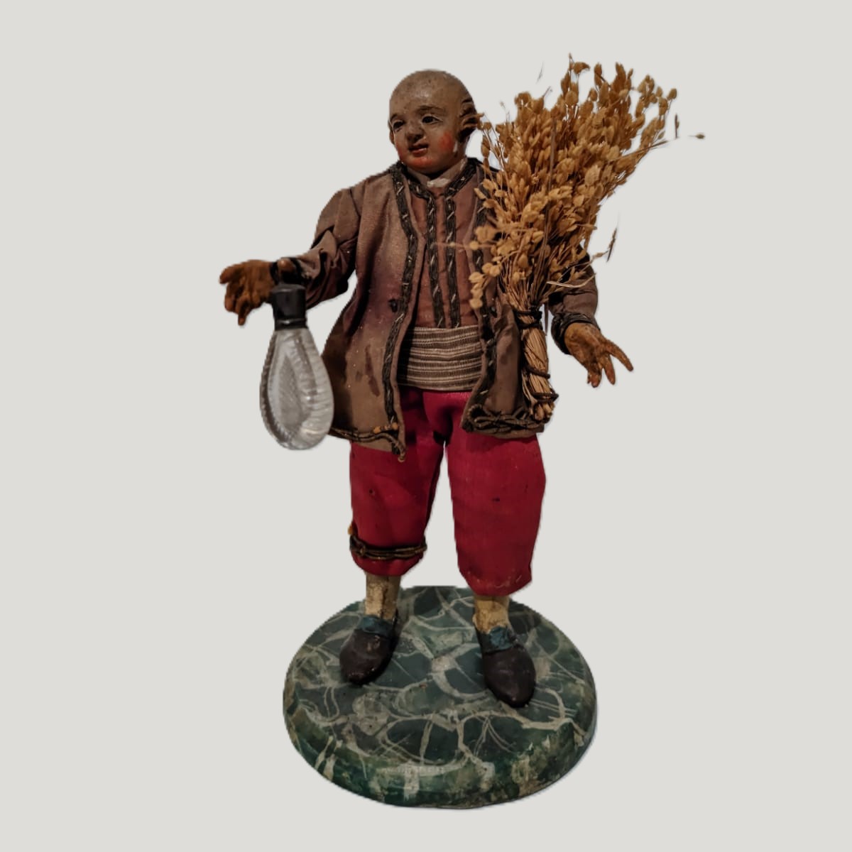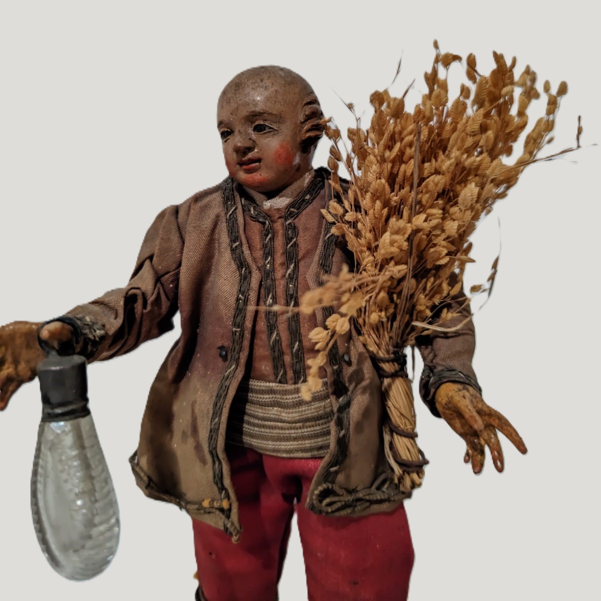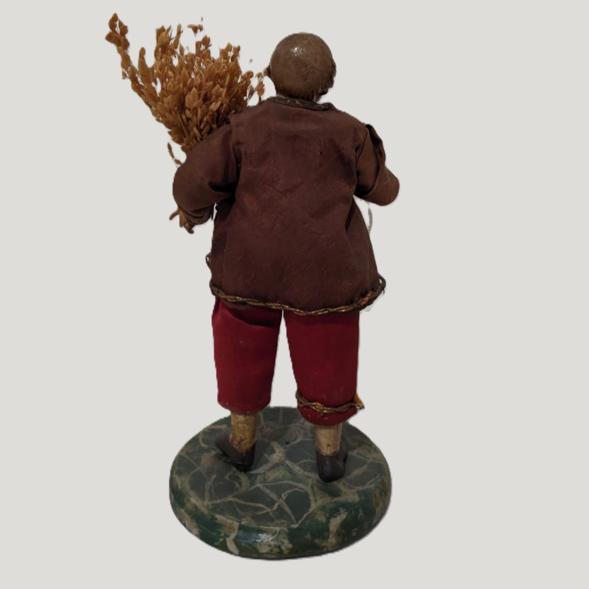 La figura da presepe viene realizzata con gli arti e il viso in ceramica e una struttura in legno rivestita in tessuti.