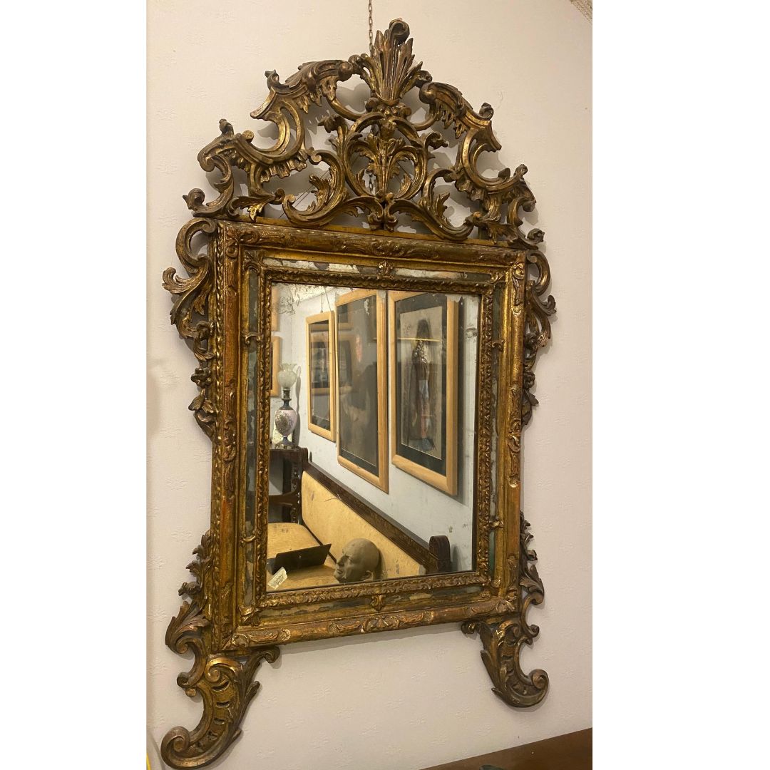 Specchiera in legno dorato a mecca con volute, intagli a motivi floreali, fregio superiore e specchio al mercurio.