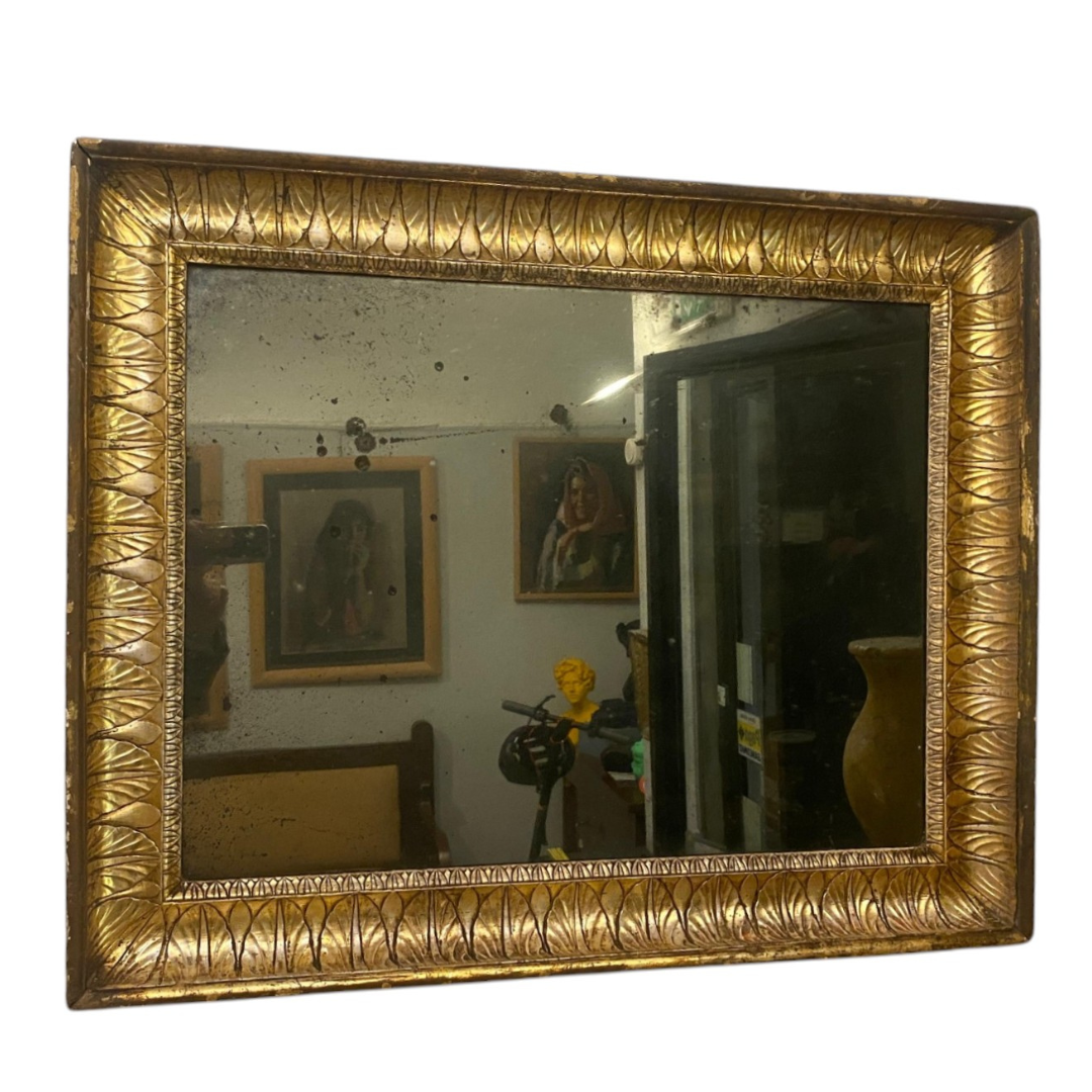 Specchiera in legno dorato a mecca con volute, intagli a motivi floreali, fregio superiore e specchio al mercurio.