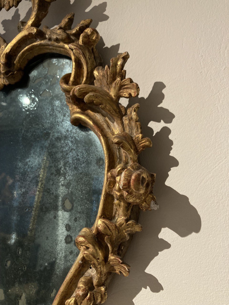 Specchiera con cornice in legno intagliato, laccato e dorato a mecca e specchio a mercurio.