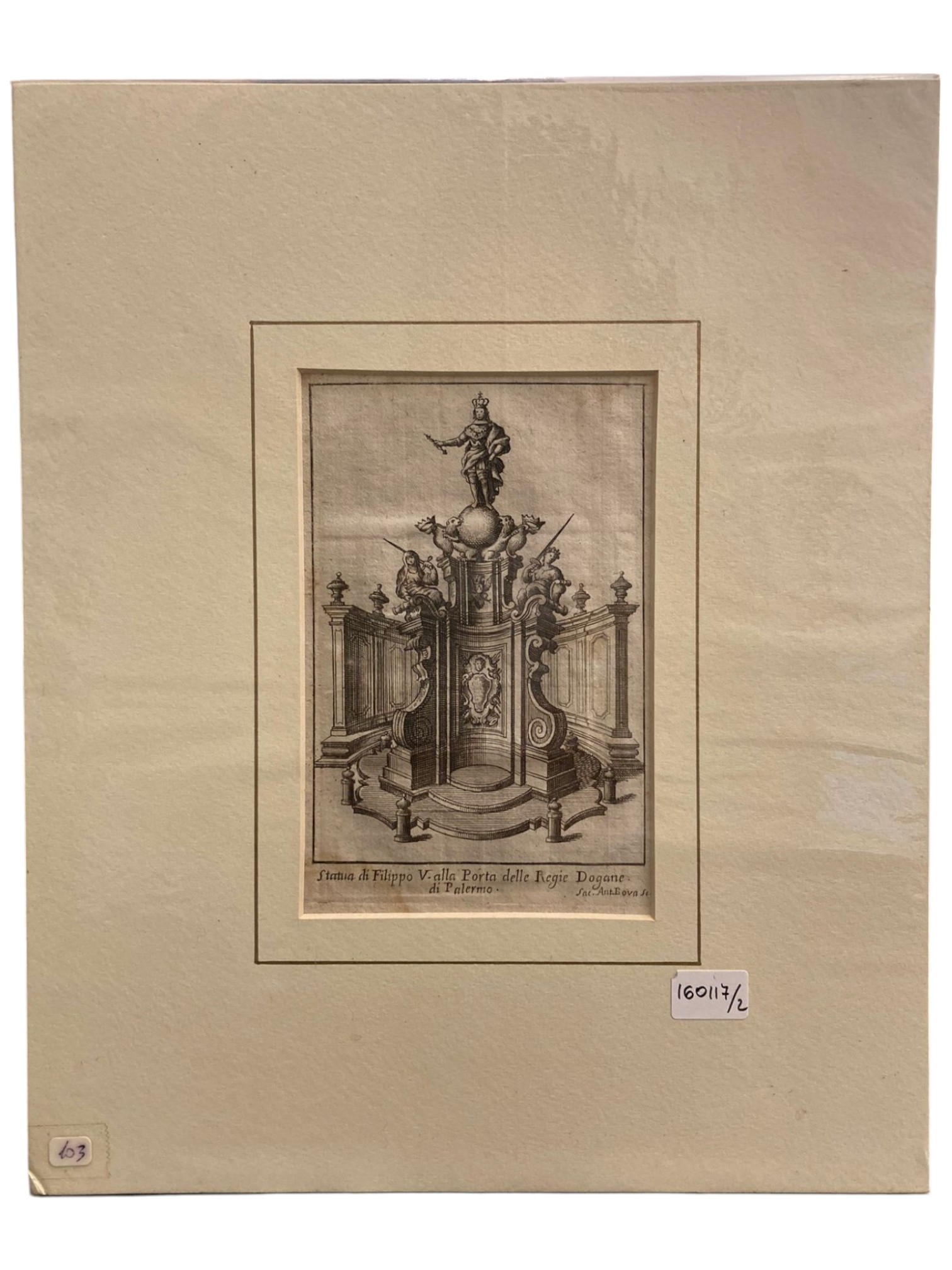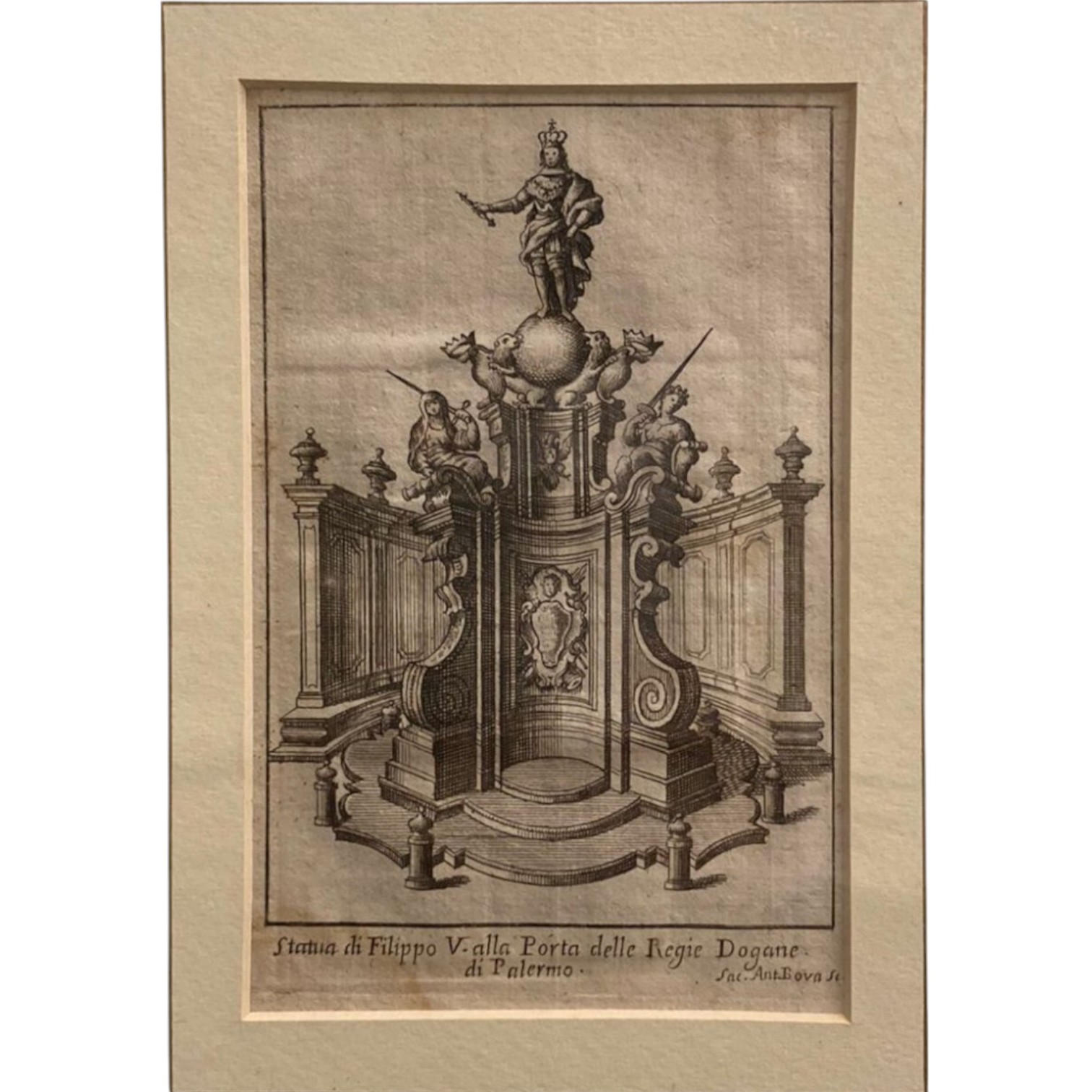 Stampa raffigurante la statua di Filippo V alla porta delle Regie Dogane di Palermo realizzato nella tecnica dell’incisione su rame nel XVIII secolo dall’incisore Bova.
