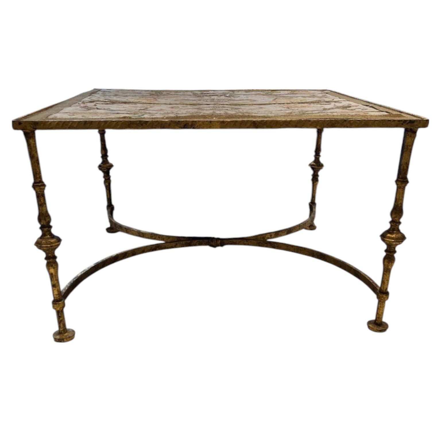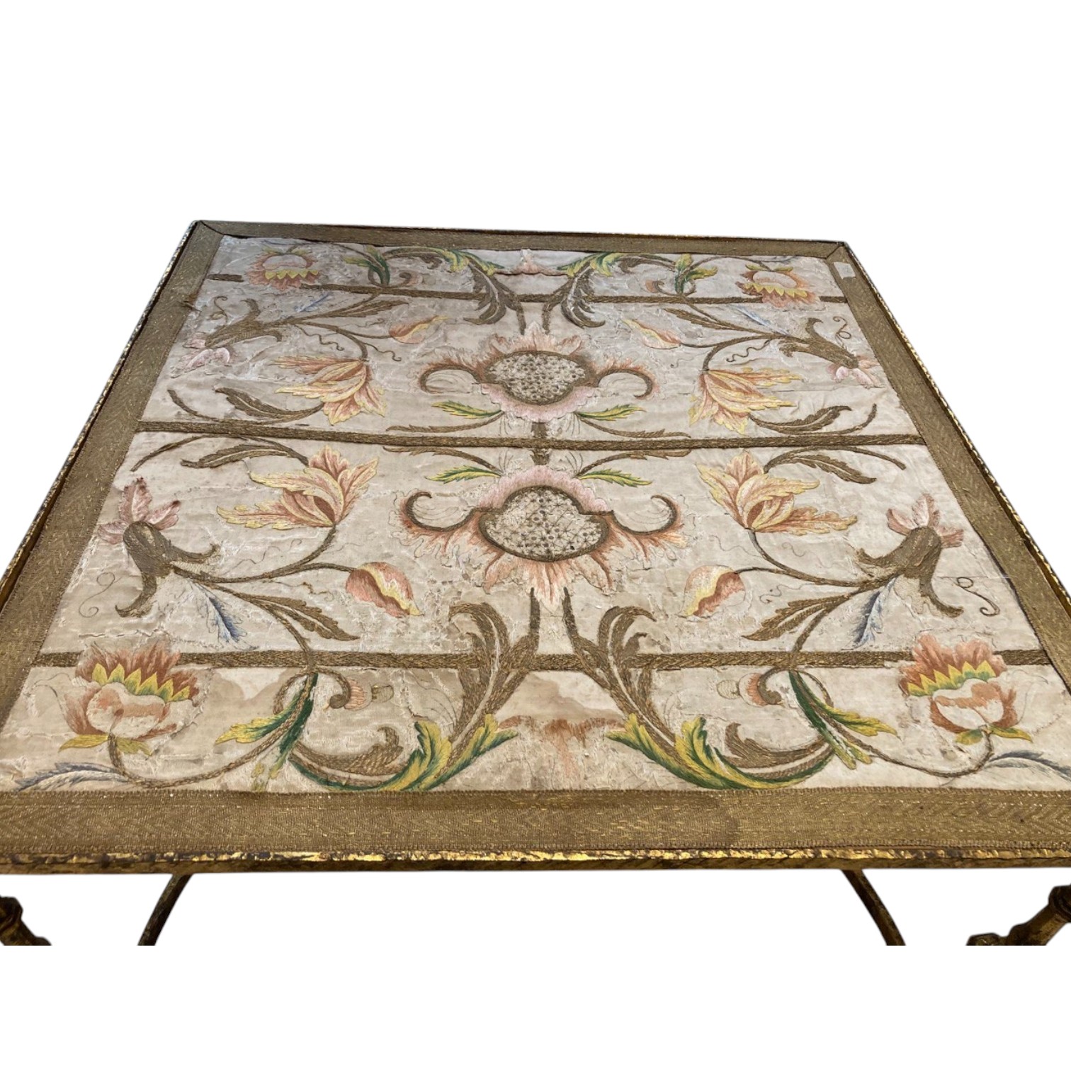 Tavolino con struttura in ferro battuto e piano a copertura in tessuto riccamente decorato con motivi floreali.