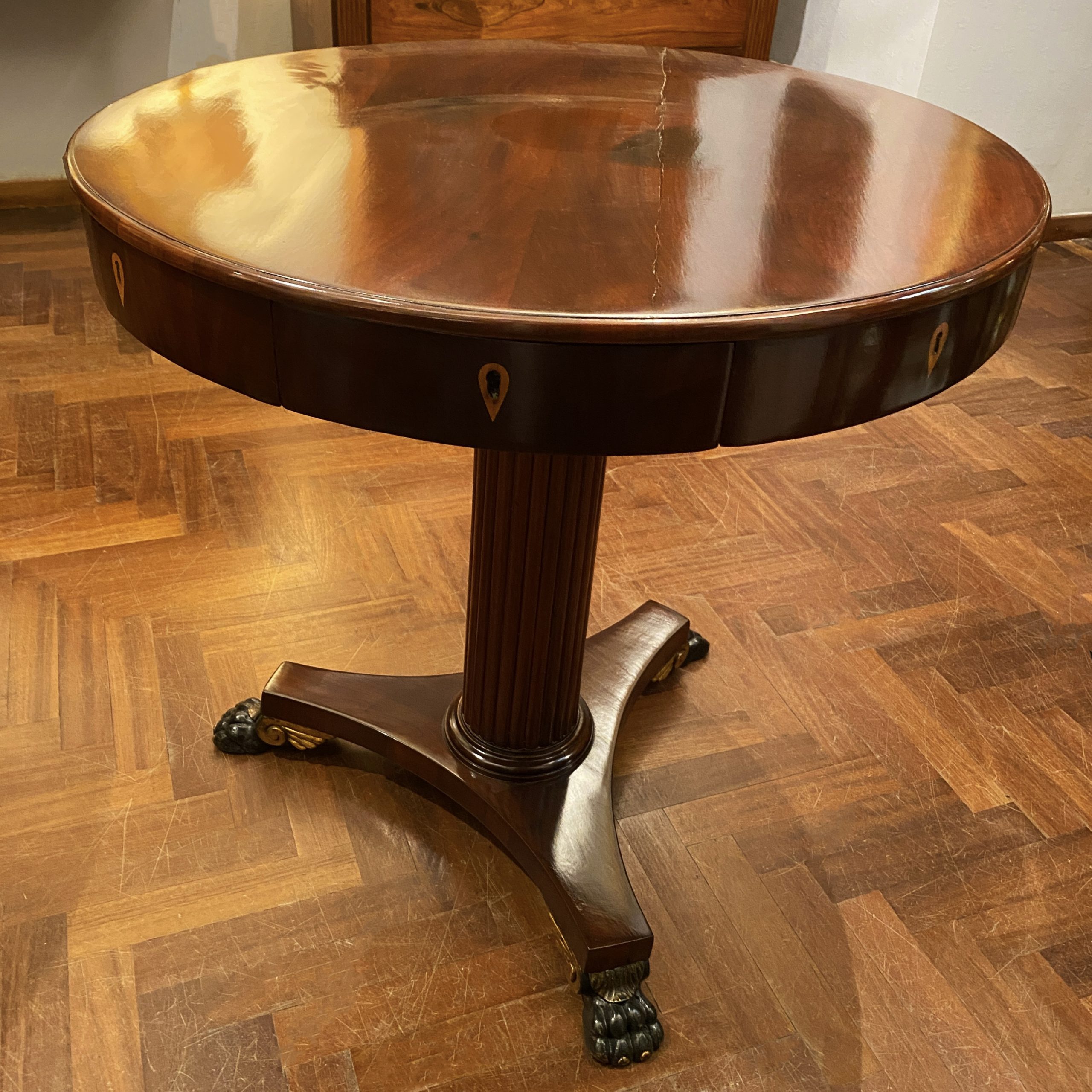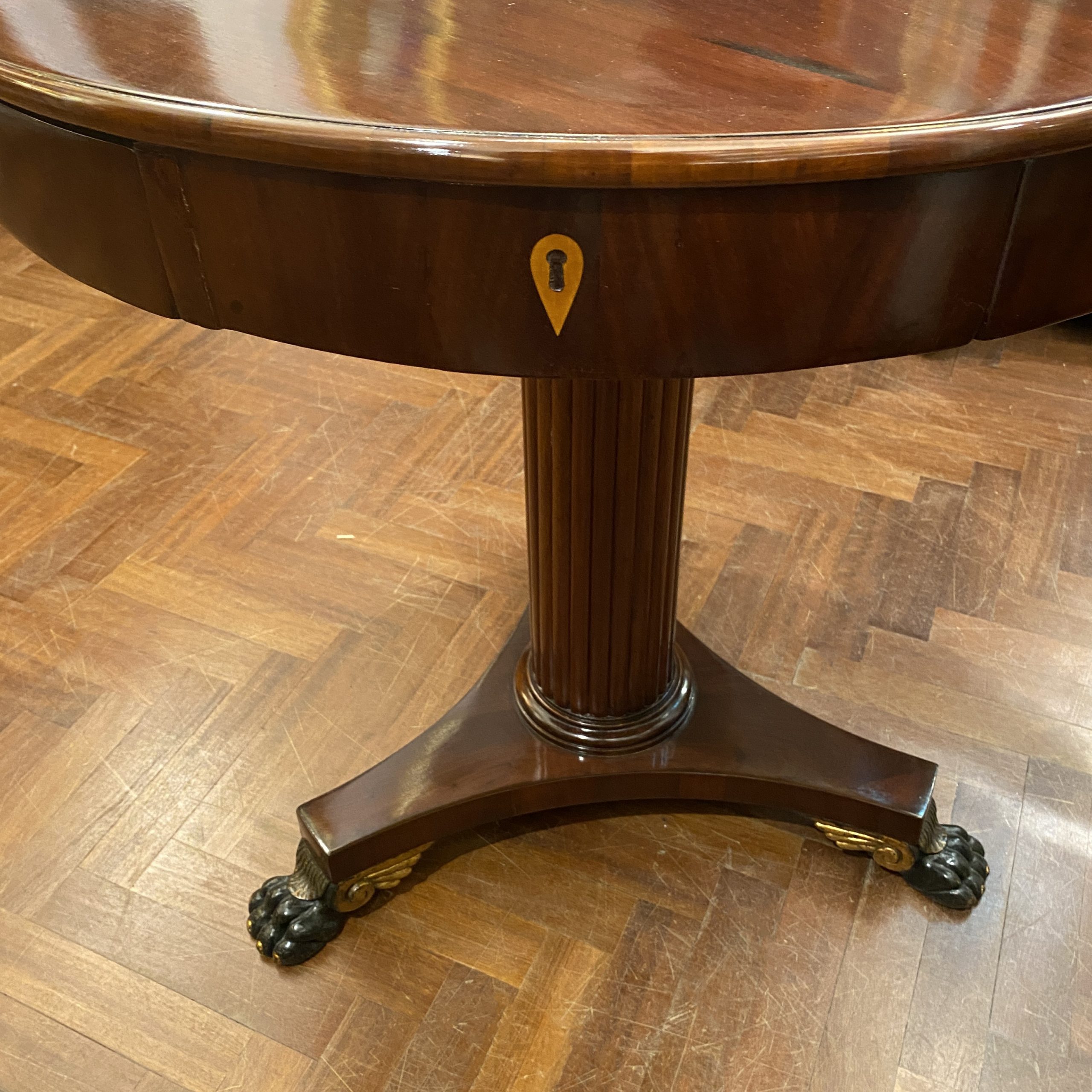 Tavolo a tamburo impiallacciato in piuma di mogano con fusto a colonna e piede felino.