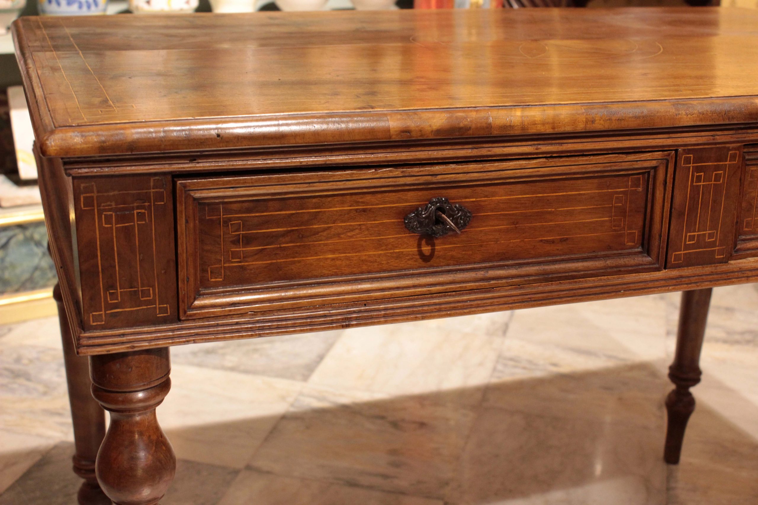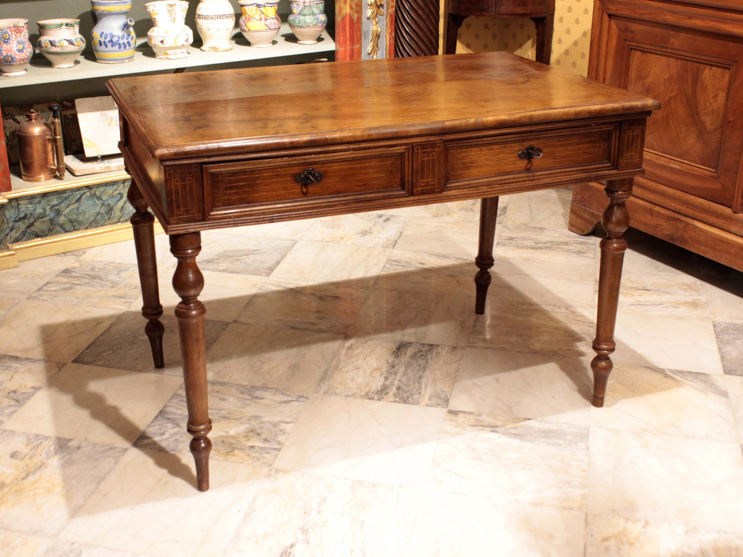 legno di noce con intarsi in bosso e borchiette in cuoio