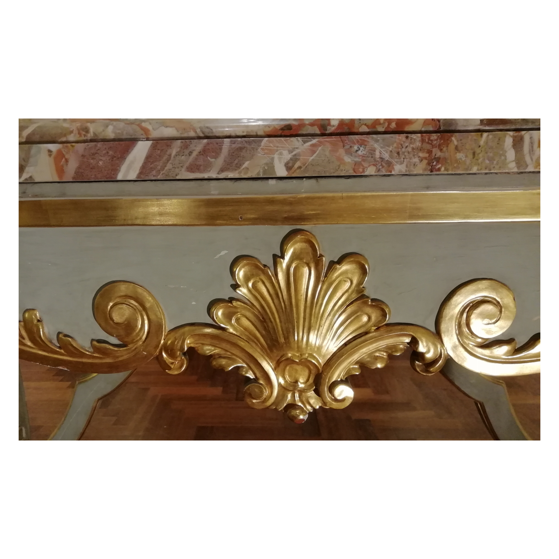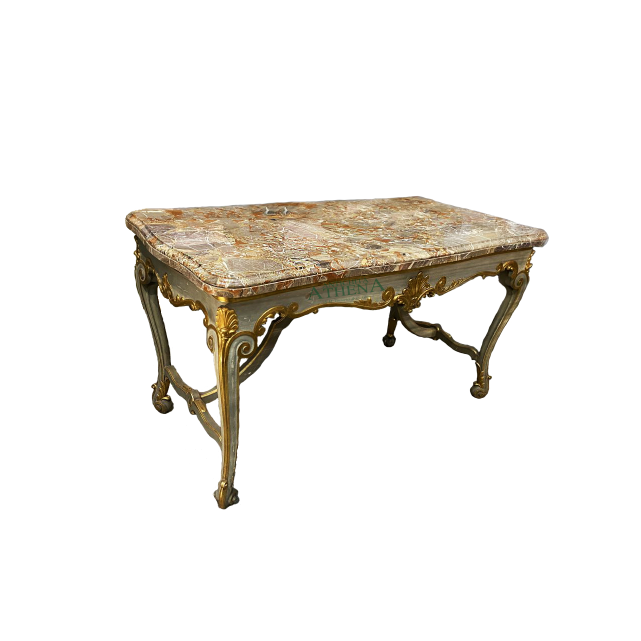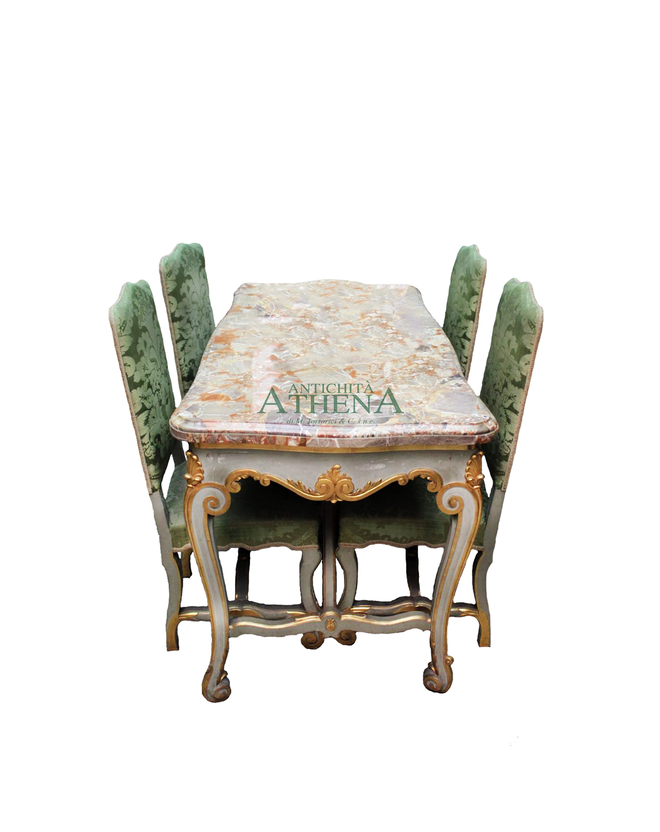 Tavolo rettangolare da centro con piedi a volute e traverse in legno laccato e dorato “a zecchino” con piano in marmo Breccia sagomato. Sedie in stoffa verde decorata.