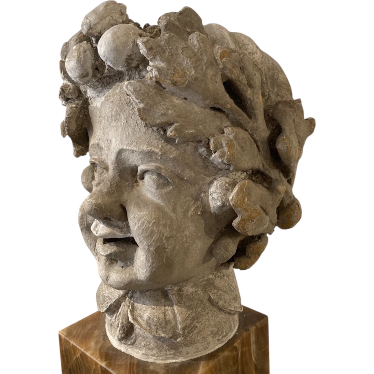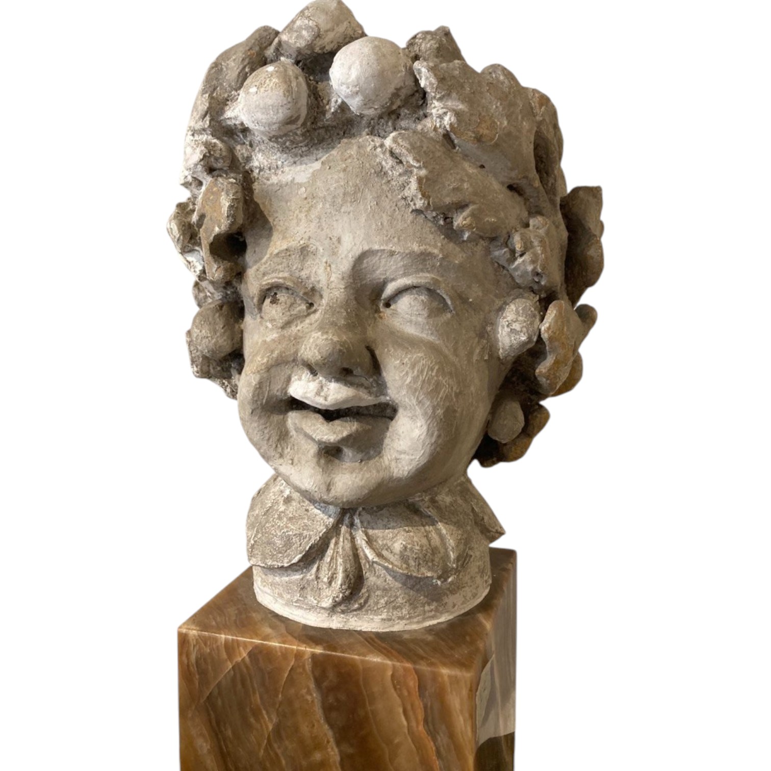 Scultura in gesso raffigurante testa di putto, base in onice.
