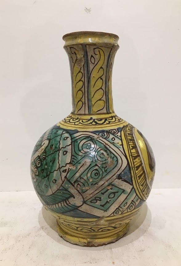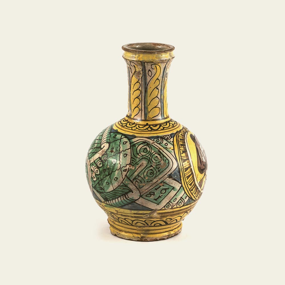Rara bottiglia in maiolica con medaglione, scudi e trofei sec XVII Burgio datata 1681