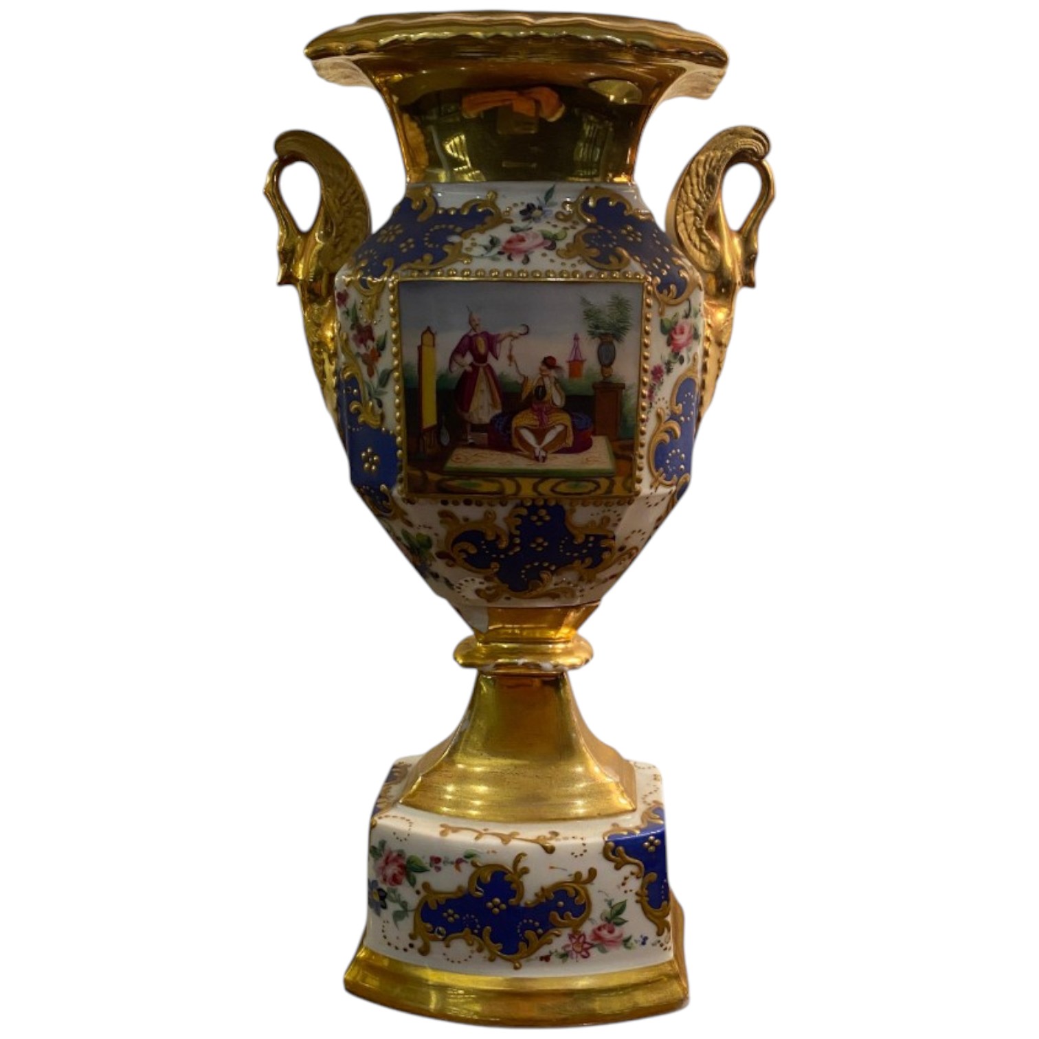 Vaso impero in porcellana decorati sul fronte e sul retro con miniature e decorazione a zecchino.