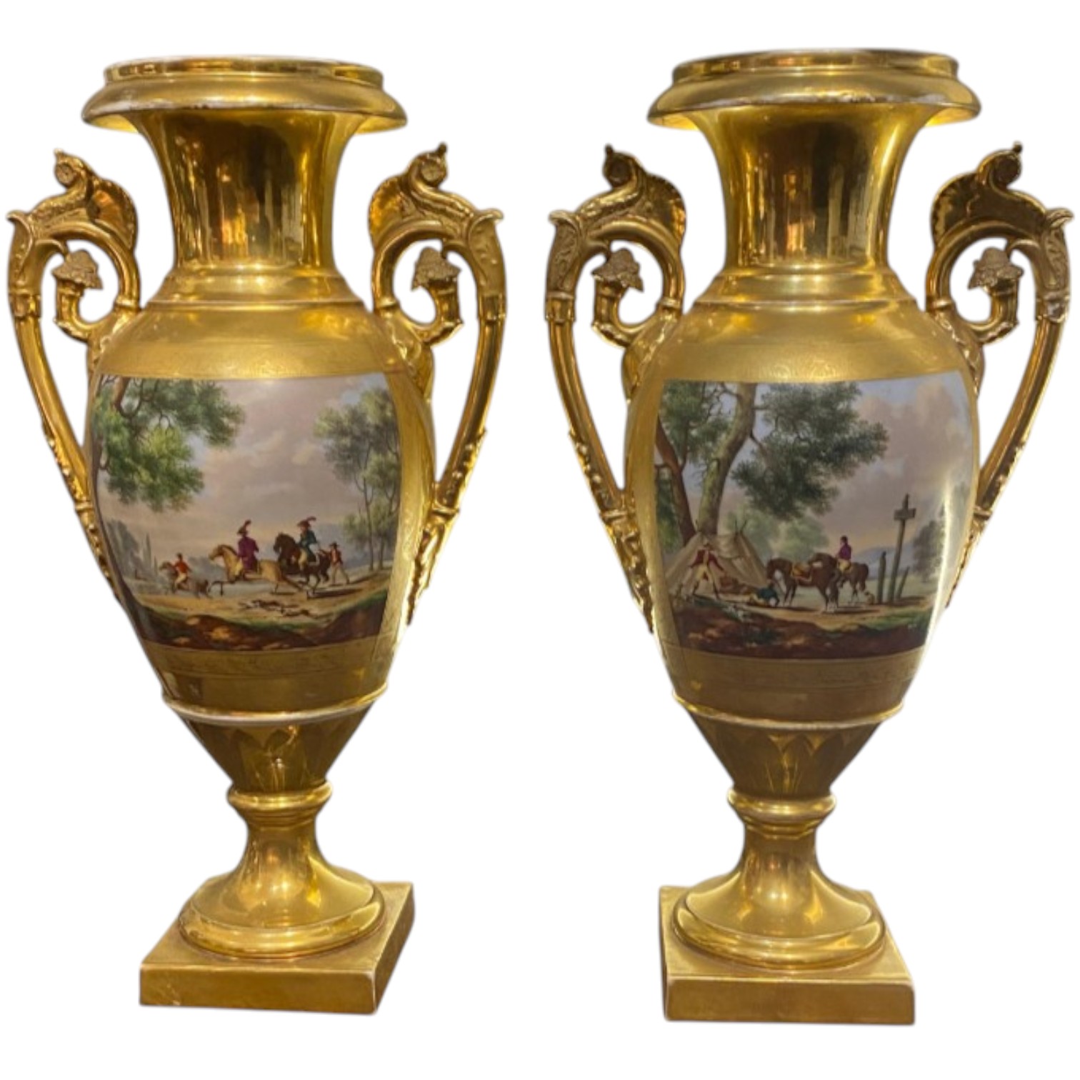 Vasi impero in porcellana decorati sul fronte e sul retro con miniature e decorazione a zecchino.