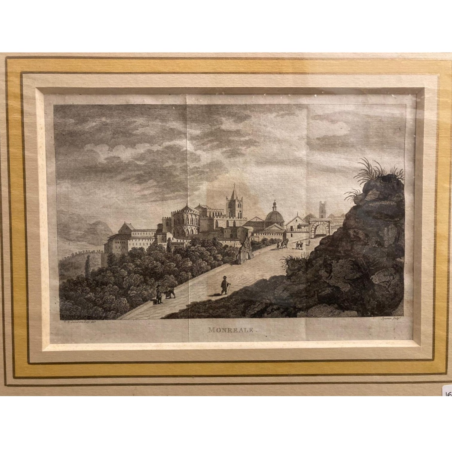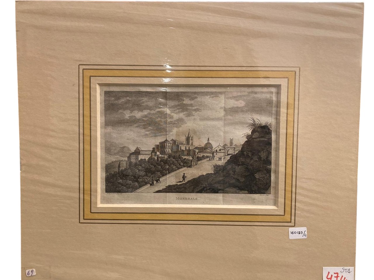 Stampa raffigurante la veduta della cittadina di Monreale realizzata con la tecnica dell’incisione su rame nel 1770 ca da Swinbourne.