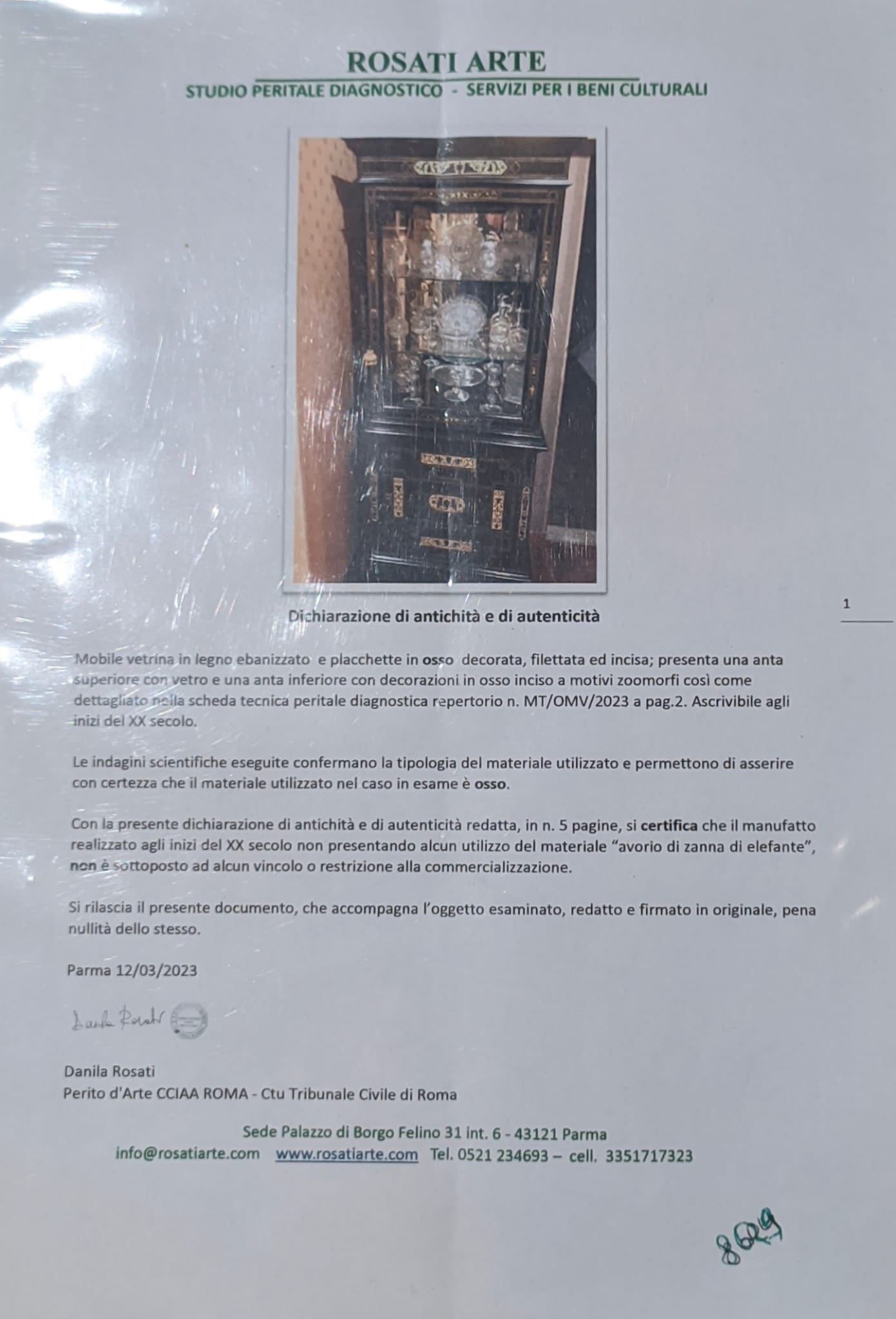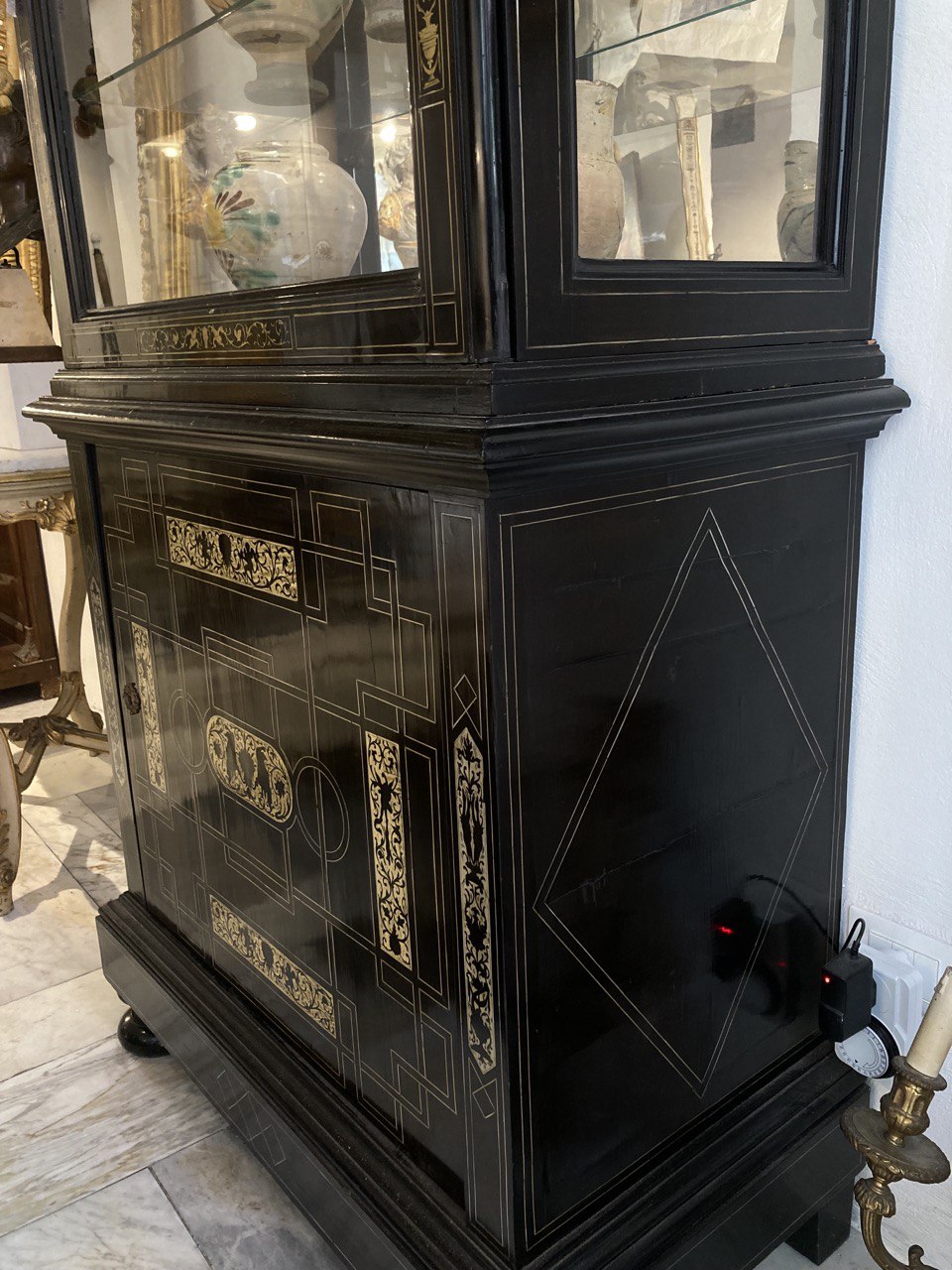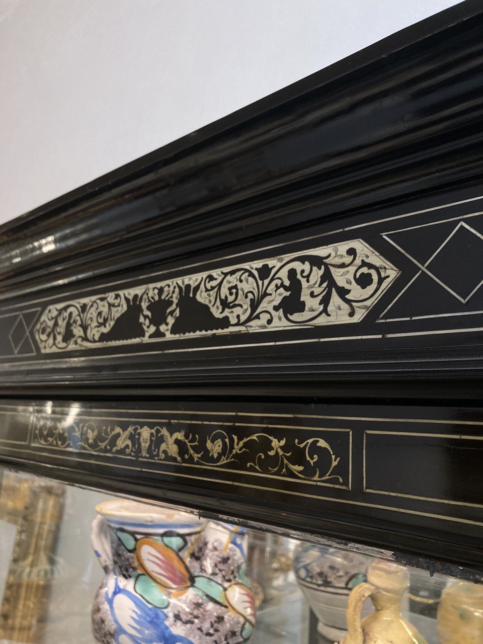 Vetrina a due ripiani in legno ebanizzato laccato e intarsi d’osso a motivi ornamentali geometrici e fitomorfi.